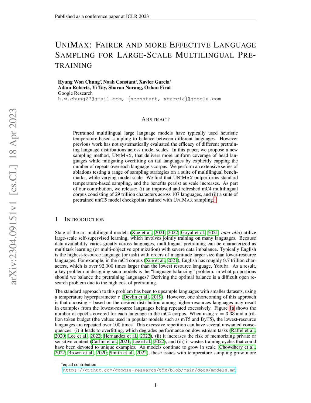 Pretrained multilingual large language models have typically used heuristic temperature-based sampling to balance between different languages. However previous work has not systematically evaluated the efficacy of different pretraining language distributions across model scales. In this paper, we propose a new sampling method, UniMax, that delivers more uniform coverage of head languages while mitigating overfitting on tail languages by explicitly capping the number of repeats over each language's corpus. We perform an extensive series of ablations testing a range of sampling strategies on a suite of multilingual benchmarks, while varying model scale. We find that UniMax outperforms standard temperature-based sampling, and the benefits persist as scale increases. As part of our contribution, we release: (i) an improved and refreshed mC4 multilingual corpus consisting of 29 trillion characters across 107 languages, and (ii) a suite of pretrained umT5 model checkpoints trained with UniMax sampling.