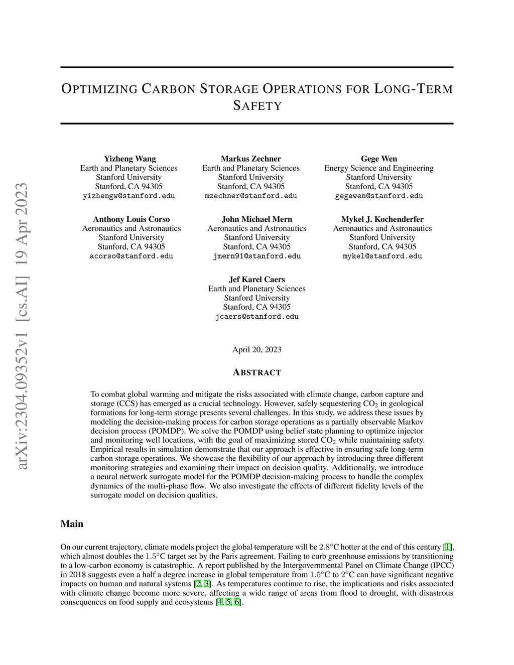 To combat global warming and mitigate the risks associated with climate change, carbon capture and storage (CCS) has emerged as a crucial technology. However, safely sequestering CO2 in geological formations for long-term storage presents several challenges. In this study, we address these issues by modeling the decision-making process for carbon storage operations as a partially observable Markov decision process (POMDP). We solve the POMDP using belief state planning to optimize injector and monitoring well locations, with the goal of maximizing stored CO2 while maintaining safety. Empirical results in simulation demonstrate that our approach is effective in ensuring safe long-term carbon storage operations. We showcase the flexibility of our approach by introducing three different monitoring strategies and examining their impact on decision quality. Additionally, we introduce a neural network surrogate model for the POMDP decision-making process to handle the complex dynamics of the multi-phase flow. We also investigate the effects of different fidelity levels of the surrogate model on decision qualities.
