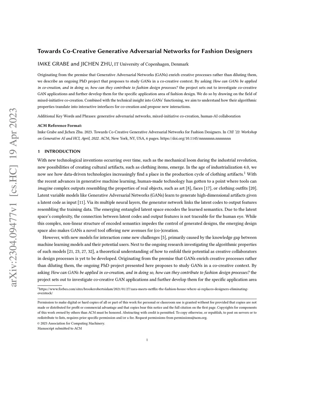 Originating from the premise that Generative Adversarial Networks (GANs) enrich creative processes rather than diluting them, we describe an ongoing PhD project that proposes to study GANs in a co-creative context. By asking How can GANs be applied in co-creation, and in doing so, how can they contribute to fashion design processes? the project sets out to investigate co-creative GAN applications and further develop them for the specific application area of fashion design. We do so by drawing on the field of mixed-initiative co-creation. Combined with the technical insight into GANs' functioning, we aim to understand how their algorithmic properties translate into interactive interfaces for co-creation and propose new interactions.