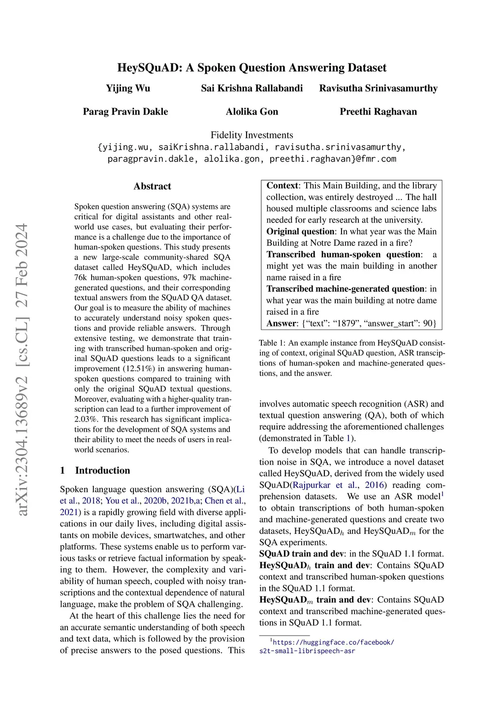 Spoken question answering (SQA) systems are critical for digital assistants and other real-world use cases, but evaluating their performance is a challenge due to the importance of human-spoken questions. This study presents a new large-scale community-shared SQA dataset called HeySQuAD, which includes 76k human-spoken questions, 97k machine-generated questions, and their corresponding textual answers from the SQuAD QA dataset. Our goal is to measure the ability of machines to accurately understand noisy spoken questions and provide reliable answers. Through extensive testing, we demonstrate that training with transcribed human-spoken and original SQuAD questions leads to a significant improvement (12.51%) in answering human-spoken questions compared to training with only the original SQuAD textual questions. Moreover, evaluating with a higher-quality transcription can lead to a further improvement of 2.03%. This research has significant implications for the development of SQA systems and their ability to meet the needs of users in real-world scenarios.