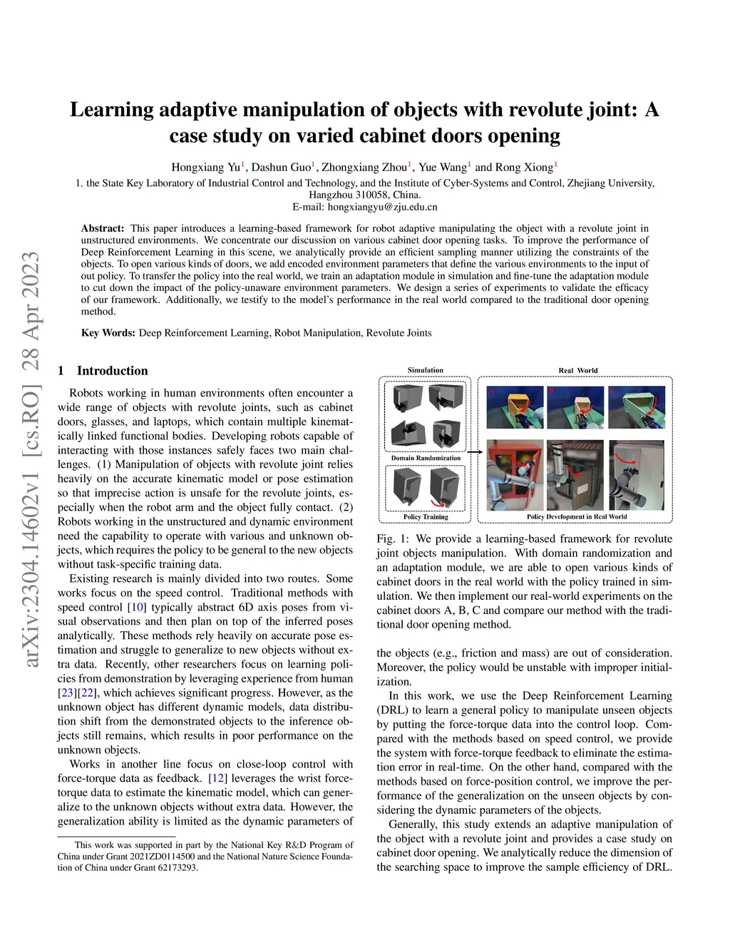 This paper introduces a learning-based framework for robot adaptive manipulating the object with a revolute joint in unstructured environments. We concentrate our discussion on various cabinet door opening tasks. To improve the performance of Deep Reinforcement Learning in this scene, we analytically provide an efficient sampling manner utilizing the constraints of the objects. To open various kinds of doors, we add encoded environment parameters that define the various environments to the input of out policy. To transfer the policy into the real world, we train an adaptation module in simulation and fine-tune the adaptation module to cut down the impact of the policy-unaware environment parameters. We design a series of experiments to validate the efficacy of our framework. Additionally, we testify to the model's performance in the real world compared to the traditional door opening method.