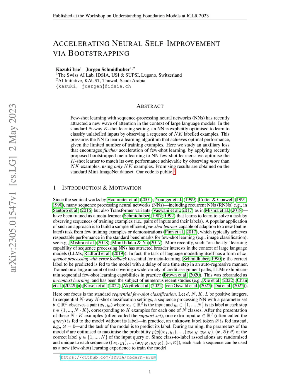Few-shot learning with sequence-processing neural networks (NNs) has recently attracted a new wave of attention in the context of large language models. In the standard N-way K-shot learning setting, an NN is explicitly optimised to learn to classify unlabelled inputs by observing a sequence of NK labelled examples. This pressures the NN to learn a learning algorithm that achieves optimal performance, given the limited number of training examples. Here we study an auxiliary loss that encourages further acceleration of few-shot learning, by applying recently proposed bootstrapped meta-learning to NN few-shot learners: we optimise the K-shot learner to match its own performance achievable by observing more than NK examples, using only NK examples. Promising results are obtained on the standard Mini-ImageNet dataset. Our code is public.