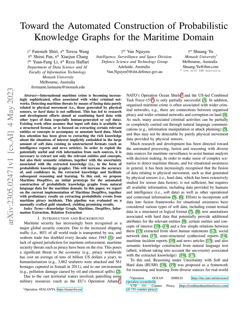 International maritime crime is becoming increasingly sophisticated, often associated with wider criminal networks. Detecting maritime threats by means of fusing data purely related to physical movement (i.e., those generated by physical sensors, or hard data) is not sufficient. This has led to research and development efforts aimed at combining hard data with other types of data (especially human-generated or soft data). Existing work often assumes that input soft data is available in a structured format, or is focused on extracting certain relevant entities or concepts to accompany or annotate hard data. Much less attention has been given to extracting the rich knowledge about the situations of interest implicitly embedded in the large amount of soft data existing in unstructured formats (such as intelligence reports and news articles). In order to exploit the potentially useful and rich information from such sources, it is necessary to extract not only the relevant entities and concepts but also their semantic relations, together with the uncertainty associated with the extracted knowledge (i.e., in the form of probabilistic knowledge graphs). This will increase the accuracy of and confidence in, the extracted knowledge and facilitate subsequent reasoning and learning. To this end, we propose Maritime DeepDive, an initial prototype for the automated construction of probabilistic knowledge graphs from natural language data for the maritime domain. In this paper, we report on the current implementation of Maritime DeepDive, together with preliminary results on extracting probabilistic events from maritime piracy incidents. This pipeline was evaluated on a manually crafted gold standard, yielding promising results.