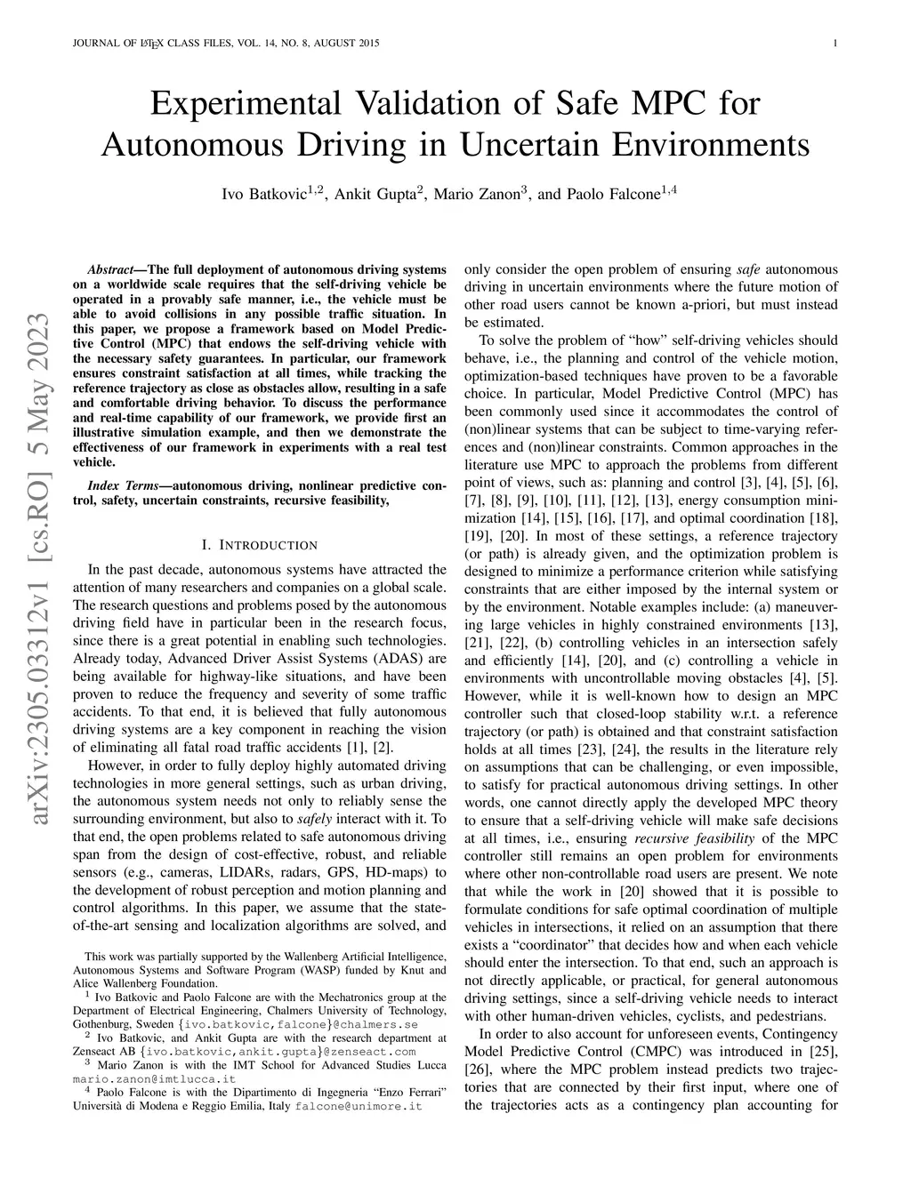 Experimental Validation of Safe MPC for Autonomous Driving in Uncertain