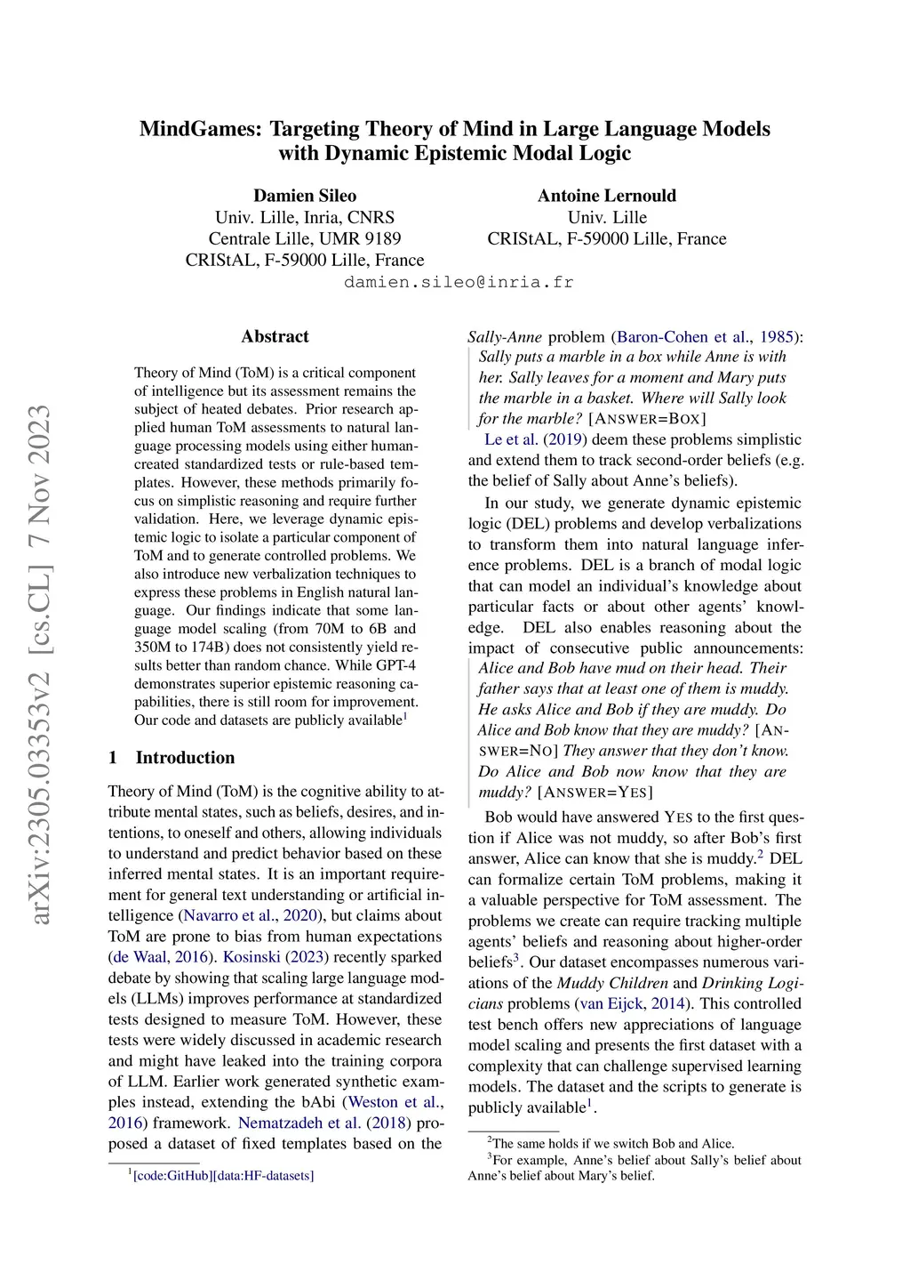 Theory of Mind (ToM) is a critical component of intelligence but its assessment remains the subject of heated debates. Prior research applied human ToM assessments to natural language processing models using either human-created standardized tests or rule-based templates. However, these methods primarily focus on simplistic reasoning and require further validation. Here, we leverage dynamic epistemic logic to isolate a particular component of ToM and to generate controlled problems. We also introduce new verbalization techniques to express these problems in English natural language. Our findings indicate that some language model scaling (from 70M to 6B and 350M to 174B) does not consistently yield results better than random chance. While GPT-4 demonstrates superior epistemic reasoning capabilities, there is still room for improvement. Our code and datasets are publicly available (https://huggingface.co/datasets/sileod/mindgames , https://github.com/sileod/llm-theory-of-mind )