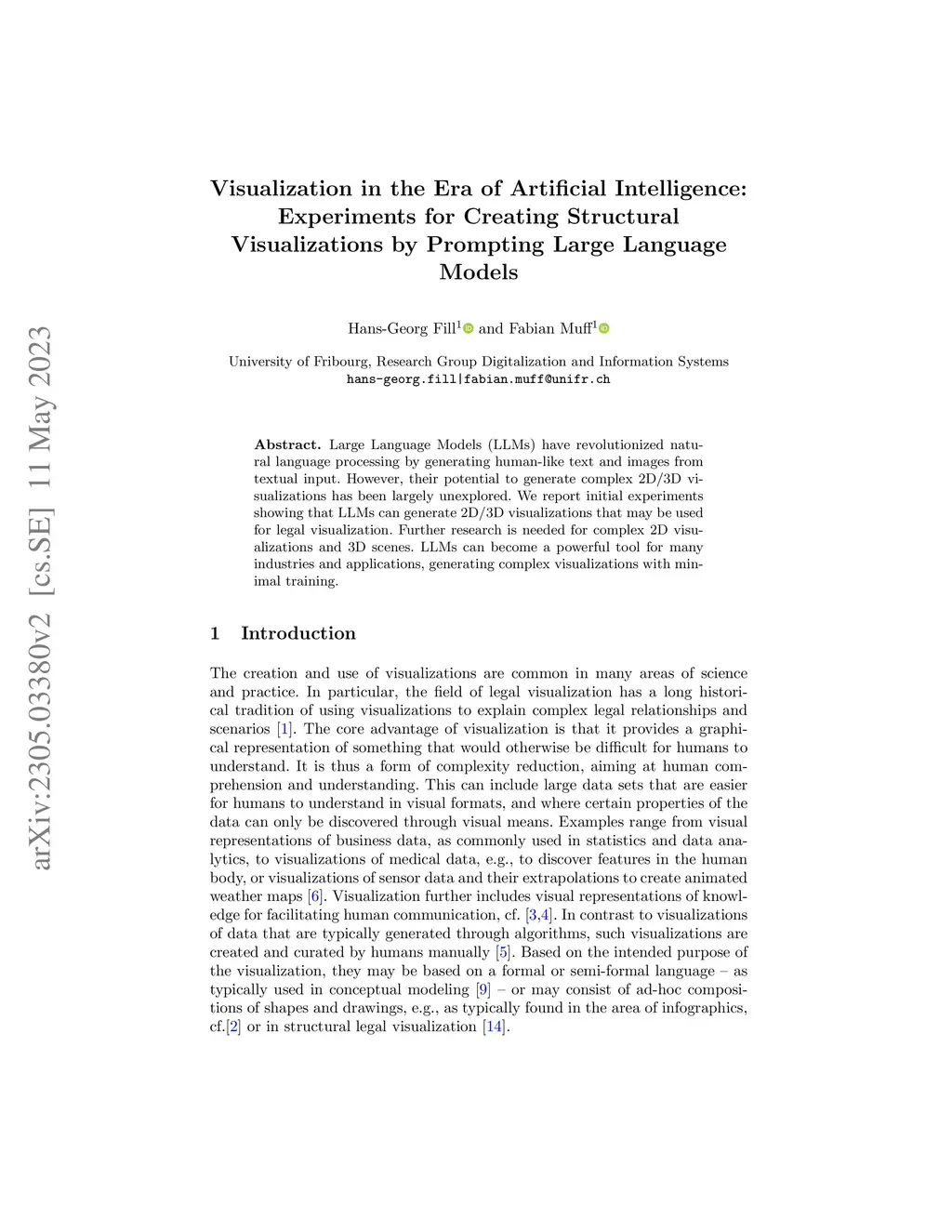 Large Language Models (LLMs) have revolutionized natural language processing by generating human-like text and images from textual input. However, their potential to generate complex 2D/3D visualizations has been largely unexplored. We report initial experiments showing that LLMs can generate 2D/3D visualizations that may be used for legal visualization. Further research is needed for complex 2D visualizations and 3D scenes. LLMs can become a powerful tool for many industries and applications, generating complex visualizations with minimal training.