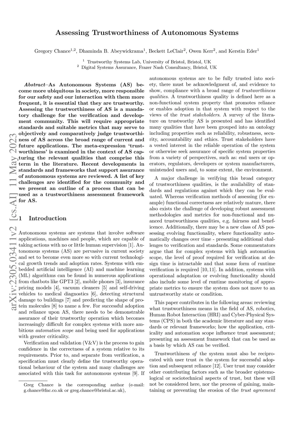 Assessing Trustworthiness of Autonomous Systems