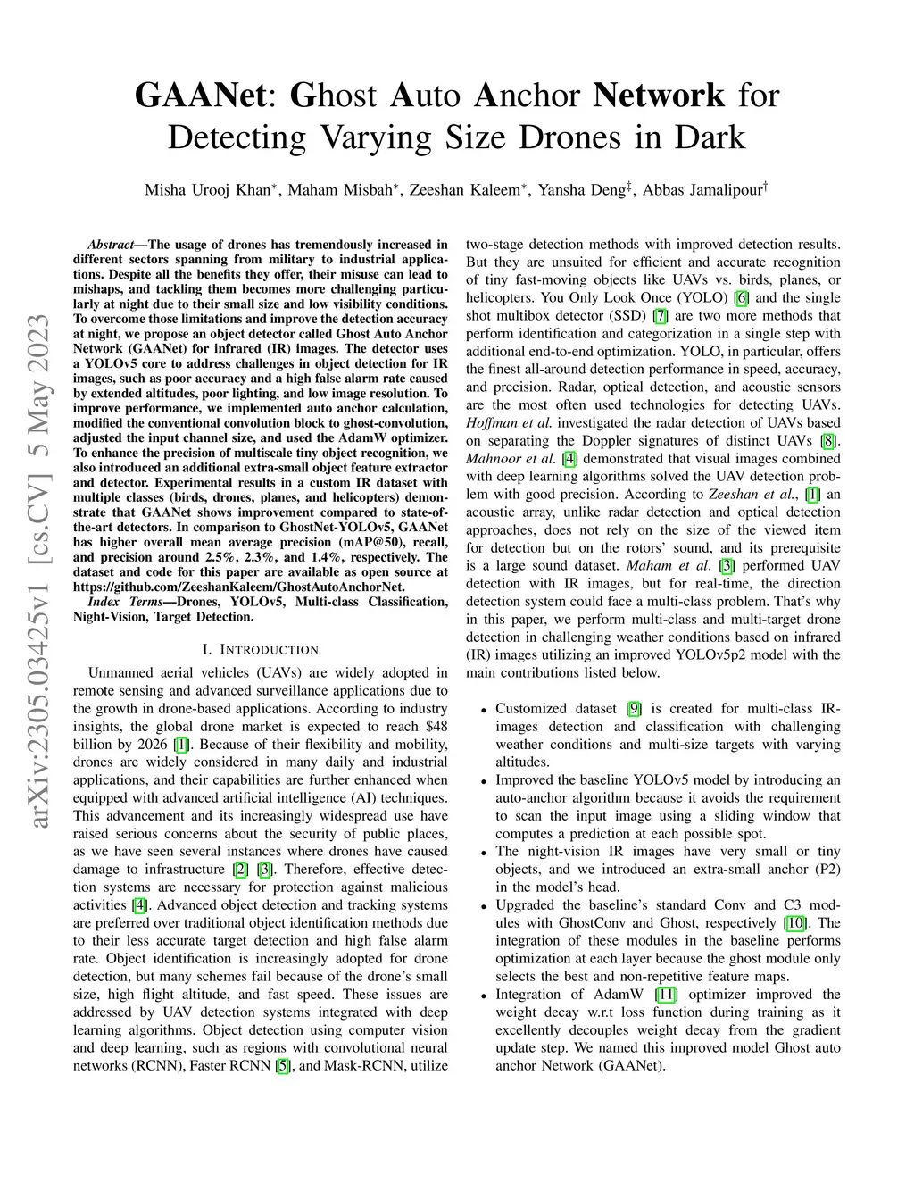 The usage of drones has tremendously increased in different sectors spanning from military to industrial applications. Despite all the benefits they offer, their misuse can lead to mishaps, and tackling them becomes more challenging particularly at night due to their small size and low visibility conditions. To overcome those limitations and improve the detection accuracy at night, we propose an object detector called Ghost Auto Anchor Network (GAANet) for infrared (IR) images. The detector uses a YOLOv5 core to address challenges in object detection for IR images, such as poor accuracy and a high false alarm rate caused by extended altitudes, poor lighting, and low image resolution. To improve performance, we implemented auto anchor calculation, modified the conventional convolution block to ghost-convolution, adjusted the input channel size, and used the AdamW optimizer. To enhance the precision of multiscale tiny object recognition, we also introduced an additional extra-small object feature extractor and detector. Experimental results in a custom IR dataset with multiple classes (birds, drones, planes, and helicopters) demonstrate that GAANet shows improvement compared to state-of-the-art detectors. In comparison to GhostNet-YOLOv5, GAANet has higher overall mean average precision (mAP@50), recall, and precision around 2.5\%, 2.3\%, and 1.4\%, respectively. The dataset and code for this paper are available as open source at https://github.com/ZeeshanKaleem/GhostAutoAnchorNet.