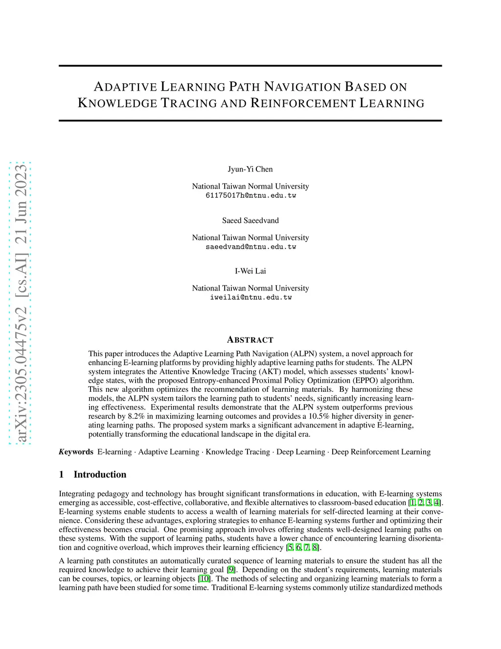 This paper introduces the Adaptive Learning Path Navigation (ALPN) system, a novel approach for enhancing E-learning platforms by providing highly adaptive learning paths for students. The ALPN system integrates the Attentive Knowledge Tracing (AKT) model, which assesses students' knowledge states, with the proposed Entropy-enhanced Proximal Policy Optimization (EPPO) algorithm. This new algorithm optimizes the recommendation of learning materials. By harmonizing these models, the ALPN system tailors the learning path to students' needs, significantly increasing learning effectiveness. Experimental results demonstrate that the ALPN system outperforms previous research by 8.2% in maximizing learning outcomes and provides a 10.5% higher diversity in generating learning paths. The proposed system marks a significant advancement in adaptive E-learning, potentially transforming the educational landscape in the digital era.