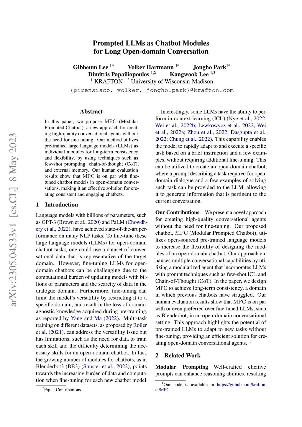 In this paper, we propose MPC (Modular Prompted Chatbot), a new approach for creating high-quality conversational agents without the need for fine-tuning. Our method utilizes pre-trained large language models (LLMs) as individual modules for long-term consistency and flexibility, by using techniques such as few-shot prompting, chain-of-thought (CoT), and external memory. Our human evaluation results show that MPC is on par with fine-tuned chatbot models in open-domain conversations, making it an effective solution for creating consistent and engaging chatbots.