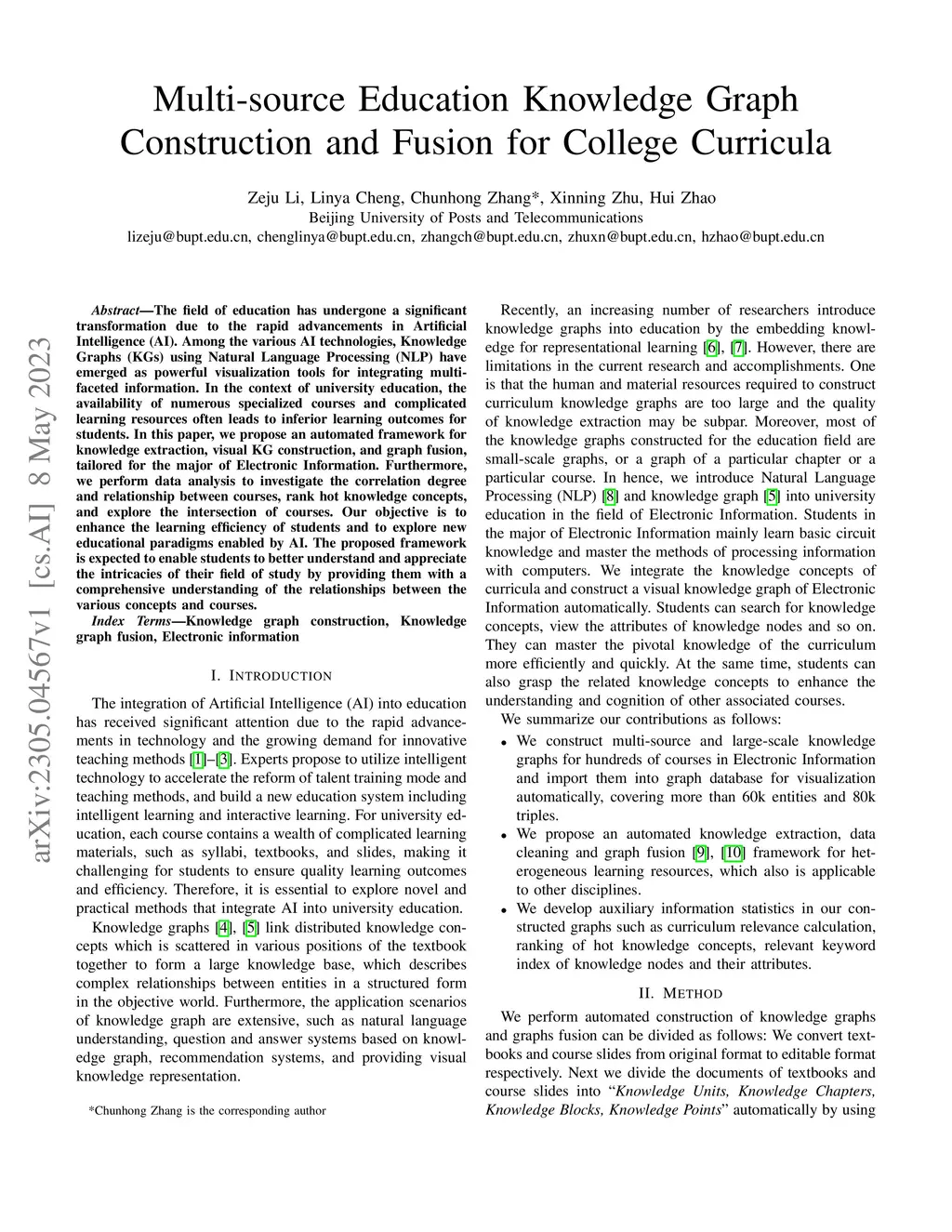 The field of education has undergone a significant transformation due to the rapid advancements in Artificial Intelligence (AI). Among the various AI technologies, Knowledge Graphs (KGs) using Natural Language Processing (NLP) have emerged as powerful visualization tools for integrating multifaceted information. In the context of university education, the availability of numerous specialized courses and complicated learning resources often leads to inferior learning outcomes for students. In this paper, we propose an automated framework for knowledge extraction, visual KG construction, and graph fusion, tailored for the major of Electronic Information. Furthermore, we perform data analysis to investigate the correlation degree and relationship between courses, rank hot knowledge concepts, and explore the intersection of courses. Our objective is to enhance the learning efficiency of students and to explore new educational paradigms enabled by AI. The proposed framework is expected to enable students to better understand and appreciate the intricacies of their field of study by providing them with a comprehensive understanding of the relationships between the various concepts and courses.