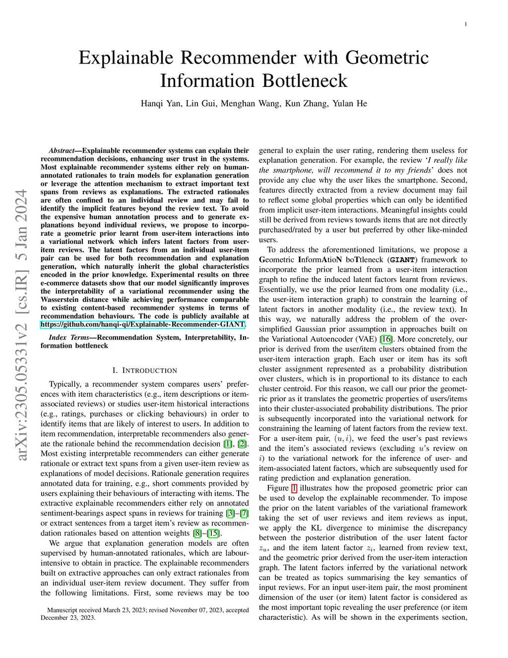 Explainable Recommender with Geometric Information Bottleneck