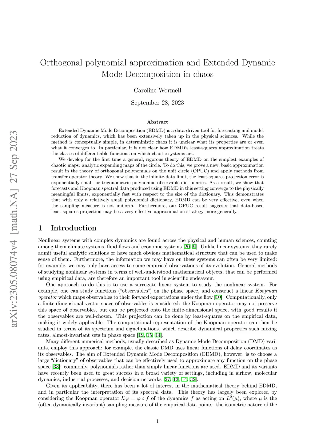 Extended Dynamic Mode Decomposition (EDMD) is a data-driven tool for forecasting and model reduction of dynamics, which has been extensively taken up in the physical sciences. While the method is conceptually simple, in deterministic chaos it is unclear what its properties are or even what it converges to. In particular, it is not clear how EDMD's least-squares approximation treats the classes of differentiable functions on which chaotic systems act. We develop for the first time a general, rigorous theory of EDMD on the simplest examples of chaotic maps: analytic expanding maps of the circle. To do this, we prove a new, basic approximation result in the theory of orthogonal polynomials on the unit circle (OPUC) and apply methods from transfer operator theory. We show that in the infinite-data limit, the least-squares projection error is exponentially small for trigonometric polynomial observable dictionaries. As a result, we show that forecasts and Koopman spectral data produced using EDMD in this setting converge to the physically meaningful limits, exponentially fast with respect to the size of the dictionary. This demonstrates that with only a relatively small polynomial dictionary, EDMD can be very effective, even when the sampling measure is not uniform. Furthermore, our OPUC result suggests that data-based least-squares projection may be a very effective approximation strategy more generally.