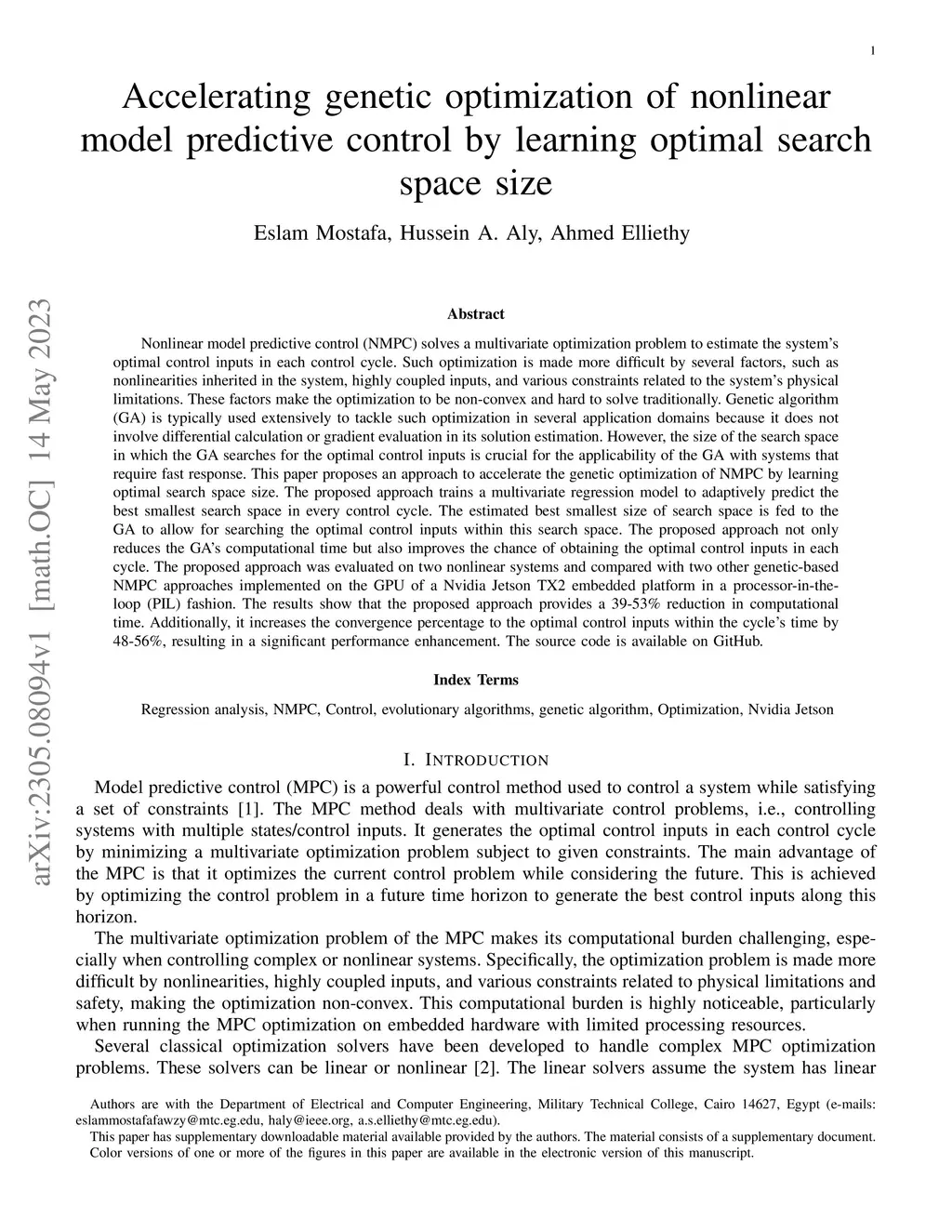 Accelerating genetic optimization of nonlinear model predictive control by learning optimal search space size