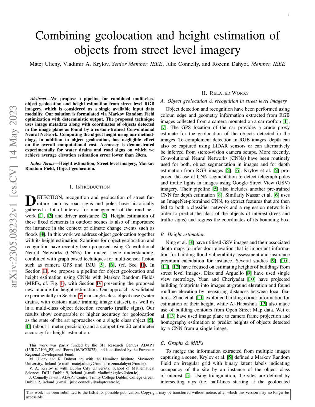 We propose a pipeline for combined multi-class object geolocation and height estimation from street level RGB imagery, which is considered as a single available input data modality. Our solution is formulated via Markov Random Field optimization with deterministic output. The proposed technique uses image metadata along with coordinates of objects detected in the image plane as found by a custom-trained Convolutional Neural Network. Computing the object height using our methodology, in addition to object geolocation, has negligible effect on the overall computational cost. Accuracy is demonstrated experimentally for water drains and road signs on which we achieve average elevation estimation error lower than 20cm.