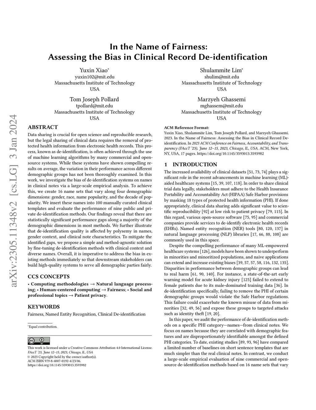 Data sharing is crucial for open science and reproducible research, but the legal sharing of clinical data requires the removal of protected health information from electronic health records. This process, known as de-identification, is often achieved through the use of machine learning algorithms by many commercial and open-source systems. While these systems have shown compelling results on average, the variation in their performance across different demographic groups has not been thoroughly examined. In this work, we investigate the bias of de-identification systems on names in clinical notes via a large-scale empirical analysis. To achieve this, we create 16 name sets that vary along four demographic dimensions: gender, race, name popularity, and the decade of popularity. We insert these names into 100 manually curated clinical templates and evaluate the performance of nine public and private de-identification methods. Our findings reveal that there are statistically significant performance gaps along a majority of the demographic dimensions in most methods. We further illustrate that de-identification quality is affected by polysemy in names, gender context, and clinical note characteristics. To mitigate the identified gaps, we propose a simple and method-agnostic solution by fine-tuning de-identification methods with clinical context and diverse names. Overall, it is imperative to address the bias in existing methods immediately so that downstream stakeholders can build high-quality systems to serve all demographic parties fairly.