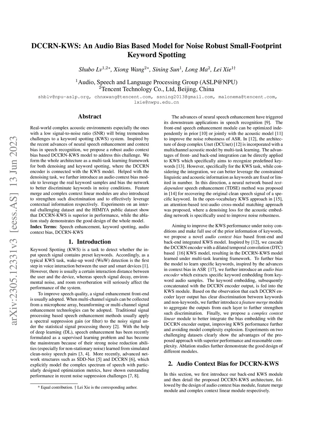 DCCRN-KWS: an audio bias based model for noise robust small-footprint