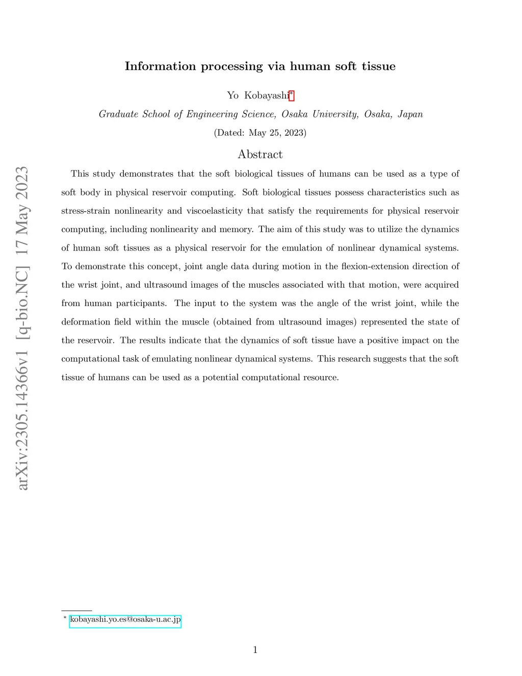 This study demonstrates that the soft biological tissues of humans can be used as a type of soft body in physical reservoir computing. Soft biological tissues possess characteristics such as stress-strain nonlinearity and viscoelasticity that satisfy the requirements for physical reservoir computing, including nonlinearity and memory. The aim of this study was to utilize the dynamics of human soft tissues as a physical reservoir for the emulation of nonlinear dynamical systems. To demonstrate this concept, joint angle data during motion in the flexion-extension direction of the wrist joint, and ultrasound images of the muscles associated with that motion, were acquired from human participants. The input to the system was the angle of the wrist joint, while the deformation field within the muscle (obtained from ultrasound images) represented the state of the reservoir. The results indicate that the dynamics of soft tissue have a positive impact on the computational task of emulating nonlinear dynamical systems. This research suggests that the soft tissue of humans can be used as a potential computational resource.