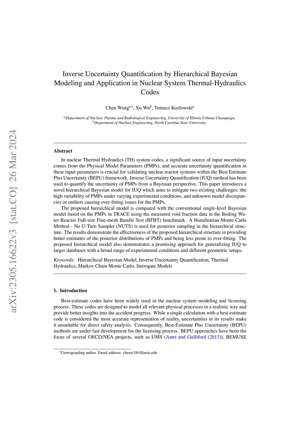 Inverse Uncertainty Quantification (IUQ) method has been widely used to quantify the uncertainty of Physical Model Parameters (PMPs) in nuclear Thermal Hydraulics (TH) systems. This paper introduces a novel hierarchical Bayesian model which aims to mitigate two existing challenges in IUQ: the high variability of PMPs under varying experimental conditions, and unknown model discrepancies or outliers causing over-fitting issues. The proposed hierarchical model is compared with the conventional single-level Bayesian model using TRACE code and the measured void fraction data in the BFBT benchmark. A Hamiltonian Monte Carlo Method - No U-Turn Sampler (NUTS) is used for posterior sampling. The results demonstrate the effectiveness of the proposed hierarchical model in providing better estimates of the posterior distributions of PMPs and being less prone to over-fitting. The proposed method also demonstrates a promising approach for generalizing IUQ to larger databases with broad ranges of experimental conditions.