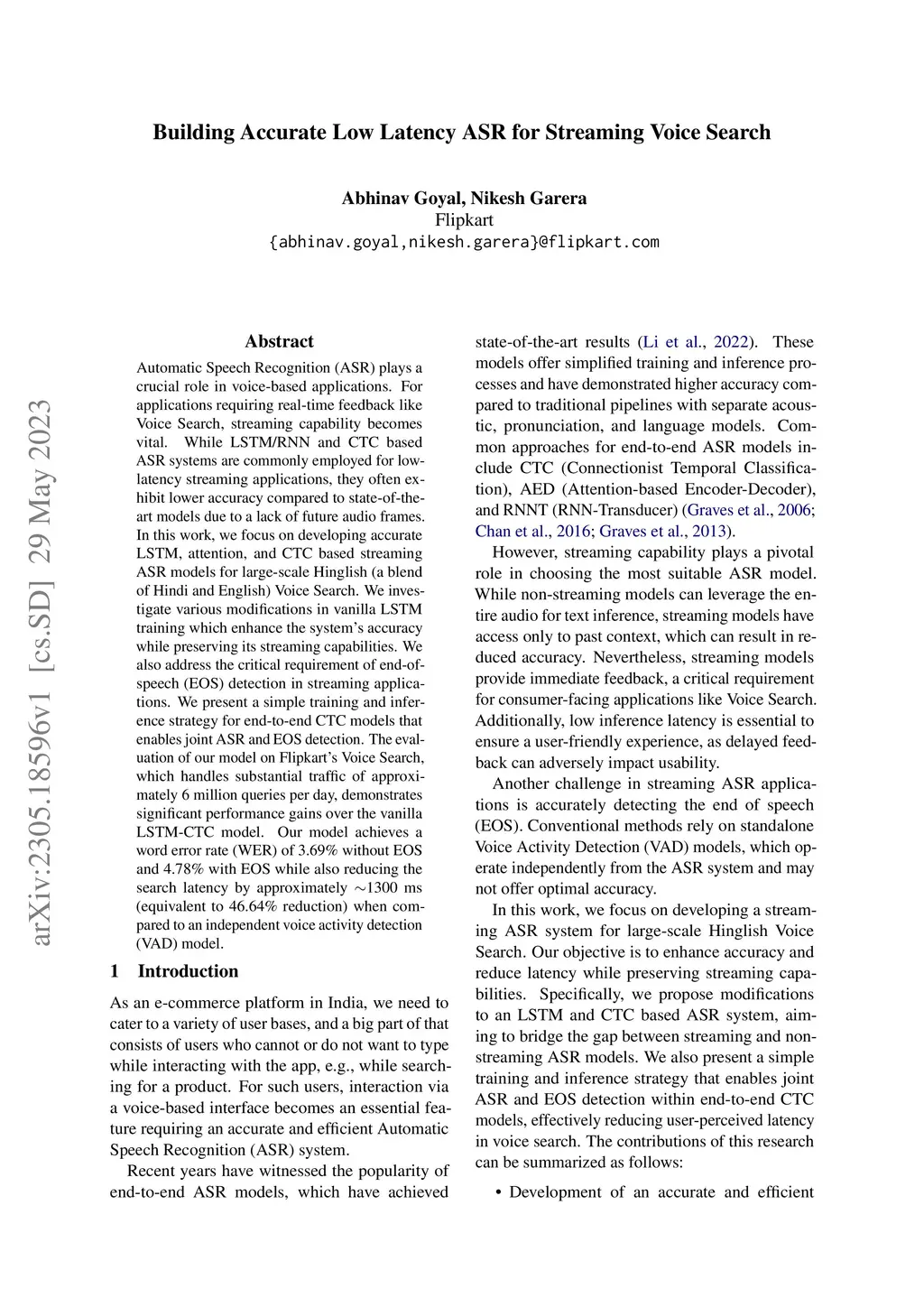 Automatic Speech Recognition (ASR) plays a crucial role in voice-based applications. For applications requiring real-time feedback like Voice Search, streaming capability becomes vital. While LSTM/RNN and CTC based ASR systems are commonly employed for low-latency streaming applications, they often exhibit lower accuracy compared to state-of-the-art models due to a lack of future audio frames. In this work, we focus on developing accurate LSTM, attention, and CTC based streaming ASR models for large-scale Hinglish (a blend of Hindi and English) Voice Search. We investigate various modifications in vanilla LSTM training which enhance the system's accuracy while preserving its streaming capabilities. We also address the critical requirement of end-of-speech (EOS) detection in streaming applications. We present a simple training and inference strategy for end-to-end CTC models that enables joint ASR and EOS detection. The evaluation of our model on Flipkart's Voice Search, which handles substantial traffic of approximately 6 million queries per day, demonstrates significant performance gains over the vanilla LSTM-CTC model. Our model achieves a word error rate (WER) of 3.69% without EOS and 4.78% with EOS while also reducing the search latency by approximately ~1300 ms (equivalent to 46.64% reduction) when compared to an independent voice activity detection (VAD) model.