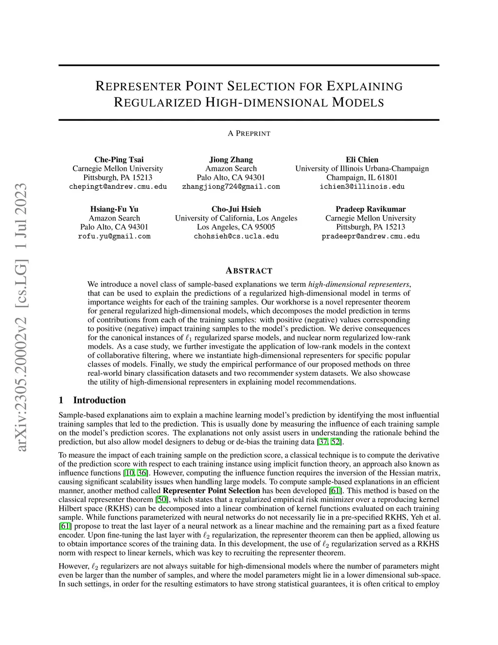 Representer Point Selection for Explaining Regularized High-dimensional