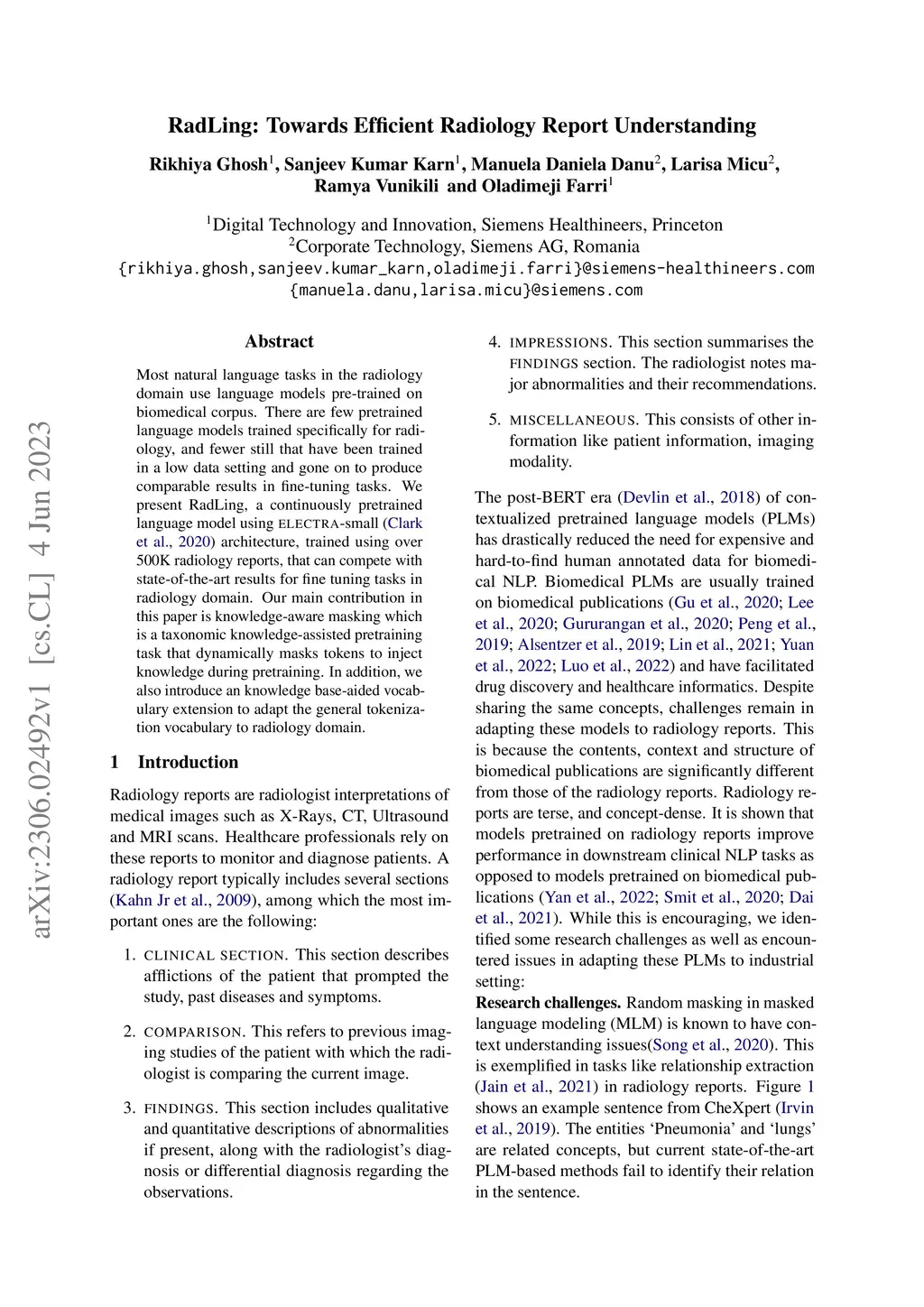 Most natural language tasks in the radiology domain use language models pre-trained on biomedical corpus. There are few pretrained language models trained specifically for radiology, and fewer still that have been trained in a low data setting and gone on to produce comparable results in fine-tuning tasks. We present RadLing, a continuously pretrained language model using Electra-small (Clark et al., 2020) architecture, trained using over 500K radiology reports, that can compete with state-of-the-art results for fine tuning tasks in radiology domain. Our main contribution in this paper is knowledge-aware masking which is a taxonomic knowledge-assisted pretraining task that dynamically masks tokens to inject knowledge during pretraining. In addition, we also introduce an knowledge base-aided vocabulary extension to adapt the general tokenization vocabulary to radiology domain.