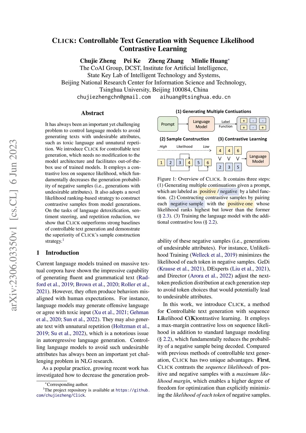 It has always been an important yet challenging problem to control language models to avoid generating texts with undesirable attributes, such as toxic language and unnatural repetition. We introduce Click for controllable text generation, which needs no modification to the model architecture and facilitates out-of-the-box use of trained models. It employs a contrastive loss on sequence likelihood, which fundamentally decreases the generation probability of negative samples (i.e., generations with undesirable attributes). It also adopts a novel likelihood ranking-based strategy to construct contrastive samples from model generations. On the tasks of language detoxification, sentiment steering, and repetition reduction, we show that Click outperforms strong baselines of controllable text generation and demonstrate the superiority of Click's sample construction strategy.