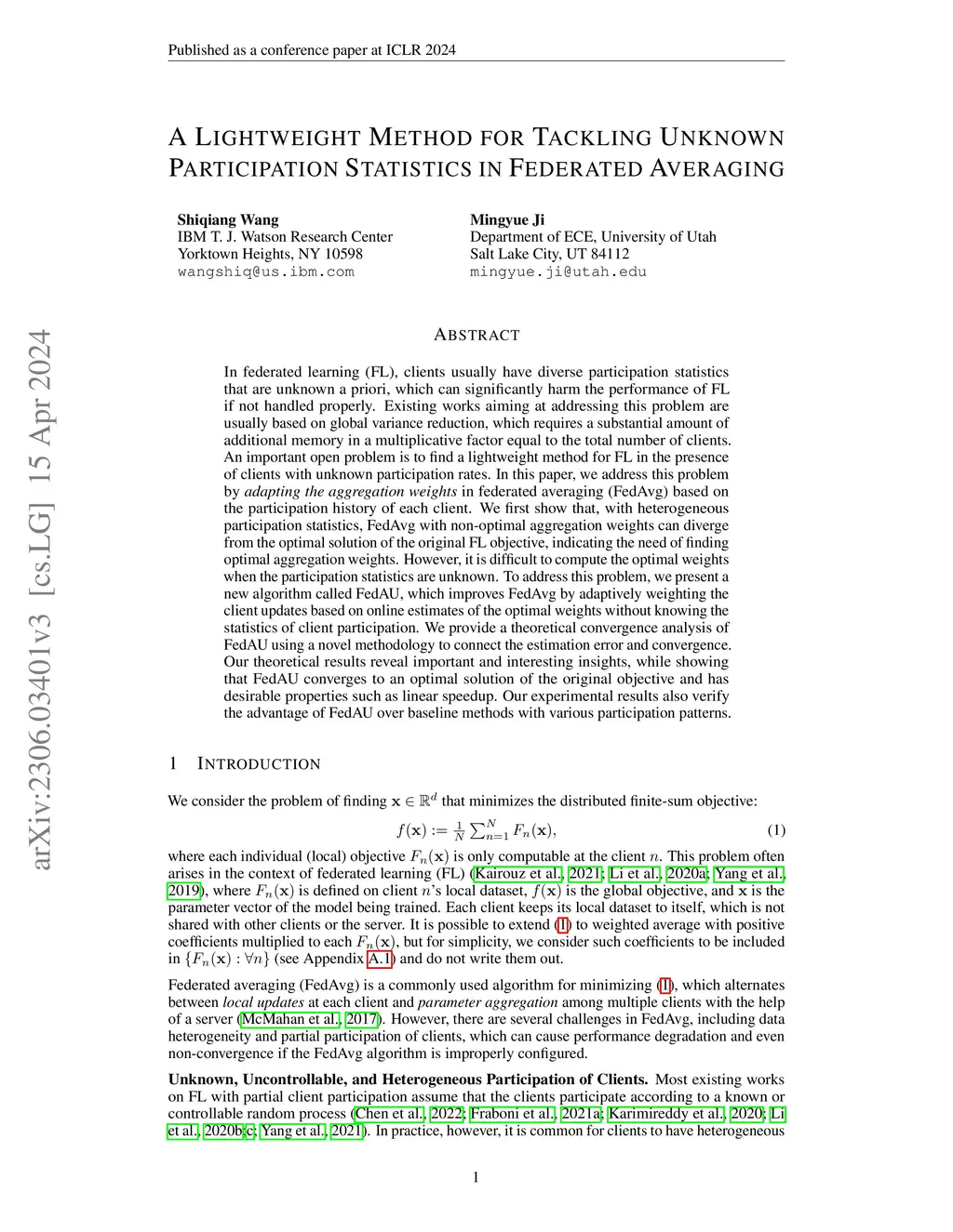 In federated learning (FL), clients usually have diverse participation statistics that are unknown a priori, which can significantly harm the performance of FL if not handled properly. Existing works aiming at addressing this problem are usually based on global variance reduction, which requires a substantial amount of additional memory in a multiplicative factor equal to the total number of clients. An important open problem is to find a lightweight method for FL in the presence of clients with unknown participation rates. In this paper, we address this problem by adapting the aggregation weights in federated averaging (FedAvg) based on the participation history of each client. We first show that, with heterogeneous participation statistics, FedAvg with non-optimal aggregation weights can diverge from the optimal solution of the original FL objective, indicating the need of finding optimal aggregation weights. However, it is difficult to compute the optimal weights when the participation statistics are unknown. To address this problem, we present a new algorithm called FedAU, which improves FedAvg by adaptively weighting the client updates based on online estimates of the optimal weights without knowing the statistics of client participation. We provide a theoretical convergence analysis of FedAU using a novel methodology to connect the estimation error and convergence. Our theoretical results reveal important and interesting insights, while showing that FedAU converges to an optimal solution of the original objective and has desirable properties such as linear speedup. Our experimental results also verify the advantage of FedAU over baseline methods with various participation patterns.