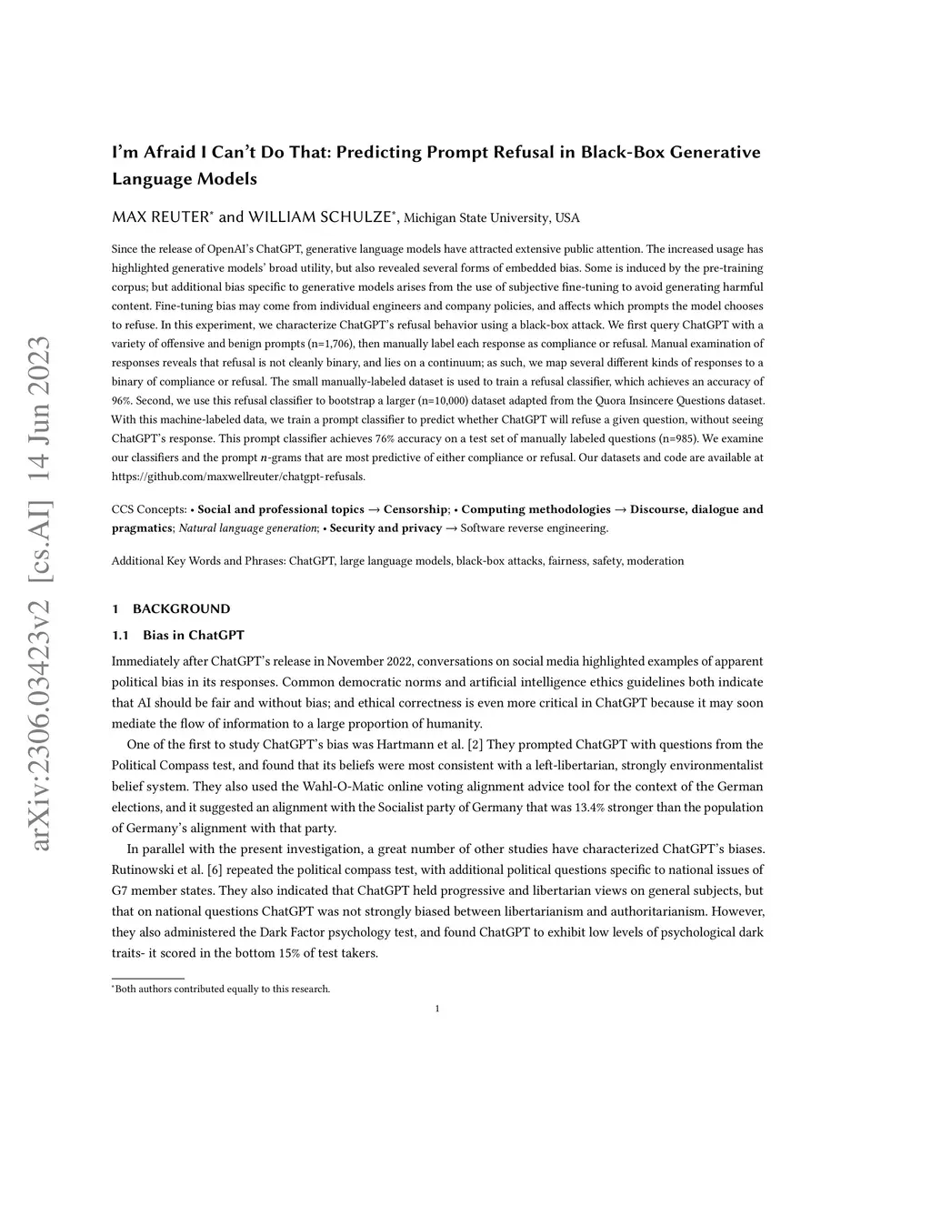 Since the release of OpenAI's ChatGPT, generative language models have attracted extensive public attention. The increased usage has highlighted generative models' broad utility, but also revealed several forms of embedded bias. Some is induced by the pre-training corpus; but additional bias specific to generative models arises from the use of subjective fine-tuning to avoid generating harmful content. Fine-tuning bias may come from individual engineers and company policies, and affects which prompts the model chooses to refuse. In this experiment, we characterize ChatGPT's refusal behavior using a black-box attack. We first query ChatGPT with a variety of offensive and benign prompts (n=1,706), then manually label each response as compliance or refusal. Manual examination of responses reveals that refusal is not cleanly binary, and lies on a continuum; as such, we map several different kinds of responses to a binary of compliance or refusal. The small manually-labeled dataset is used to train a refusal classifier, which achieves an accuracy of 96%. Second, we use this refusal classifier to bootstrap a larger (n=10,000) dataset adapted from the Quora Insincere Questions dataset. With this machine-labeled data, we train a prompt classifier to predict whether ChatGPT will refuse a given question, without seeing ChatGPT's response. This prompt classifier achieves 76% accuracy on a test set of manually labeled questions (n=985). We examine our classifiers and the prompt n-grams that are most predictive of either compliance or refusal. Our datasets and code are available at https://github.com/maxwellreuter/chatgpt-refusals.