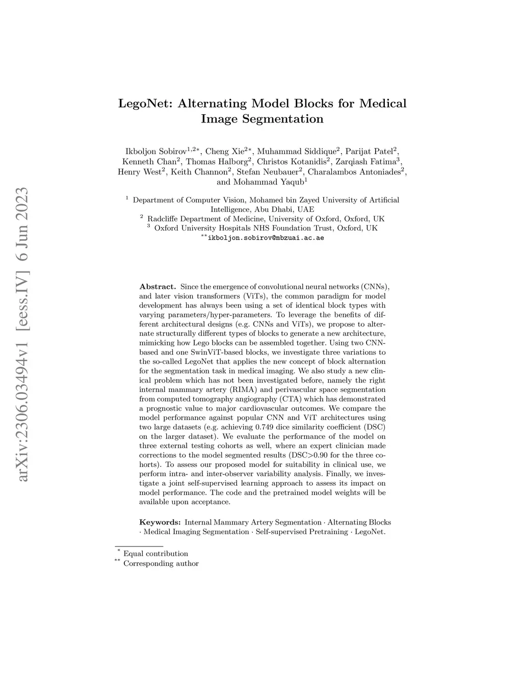 Since the emergence of convolutional neural networks (CNNs) and, later, vision transformers (ViTs), deep learning architectures have predominantly relied on identical block types with varying hyperparameters. We propose a novel block alternation strategy to leverage the complementary strengths of different architectural designs, assembling structurally distinct components similar to Lego blocks. We introduce LegoNet, a deep learning framework that alternates CNN-based and SwinViT-based blocks to enhance feature learning for medical image segmentation. We investigate three variations of LegoNet and apply this concept to a previously unexplored clinical problem: the segmentation of the internal mammary artery (IMA), aorta, and perivascular adipose tissue (PVAT) from computed tomography angiography (CTA) scans. These PVAT regions have been shown to possess prognostic value in assessing cardiovascular risk and primary clinical outcomes. We evaluate LegoNet on large datasets, achieving superior performance to other leading architectures. Furthermore, we assess the model's generalizability on external testing cohorts, where an expert clinician corrects the model's segmentations, achieving DSC > 0.90 across various external, international, and public cohorts. To further validate the model's clinical reliability, we perform intra- and inter-observer variability analysis, demonstrating strong agreement with human annotations. The proposed methodology has significant implications for diagnostic cardiovascular management and early prognosis, offering a robust, automated solution for vascular and perivascular segmentation and risk assessment in clinical practice, paving the way for personalised medicine.
