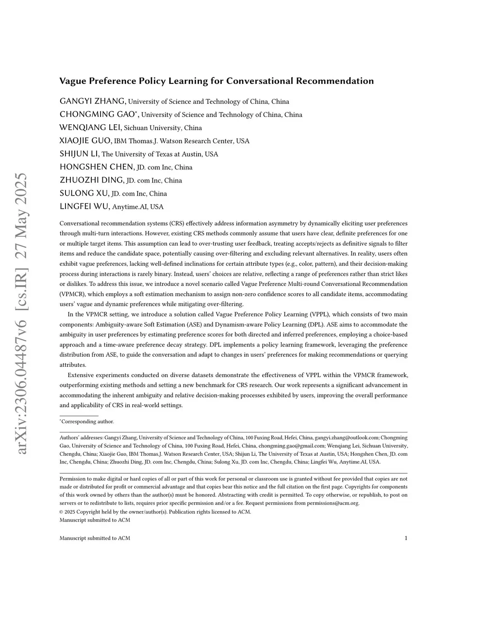 Conversational recommendation systems (CRS) commonly assume users have clear preferences, leading to potential over-filtering of relevant alternatives. However, users often exhibit vague, non-binary preferences. We introduce the Vague Preference Multi-round Conversational Recommendation (VPMCR) scenario, employing a soft estimation mechanism to accommodate users' vague and dynamic preferences while mitigating over-filtering. In VPMCR, we propose Vague Preference Policy Learning (VPPL), consisting of Ambiguity-aware Soft Estimation (ASE) and Dynamism-aware Policy Learning (DPL). ASE captures preference vagueness by estimating scores for clicked and non-clicked options, using a choice-based approach and time-aware preference decay. DPL leverages ASE's preference distribution to guide the conversation and adapt to preference changes for recommendations or attribute queries. Extensive experiments demonstrate VPPL's effectiveness within VPMCR, outperforming existing methods and setting a new benchmark. Our work advances CRS by accommodating users' inherent ambiguity and relative decision-making processes, improving real-world applicability.