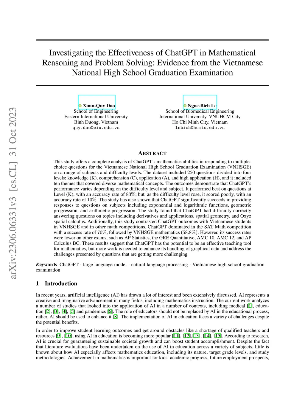 Investigating the Effectiveness of ChatGPT in Mathematical Reasoning and Problem Solving: Evidence from the Vietnamese National High School Graduation Examination