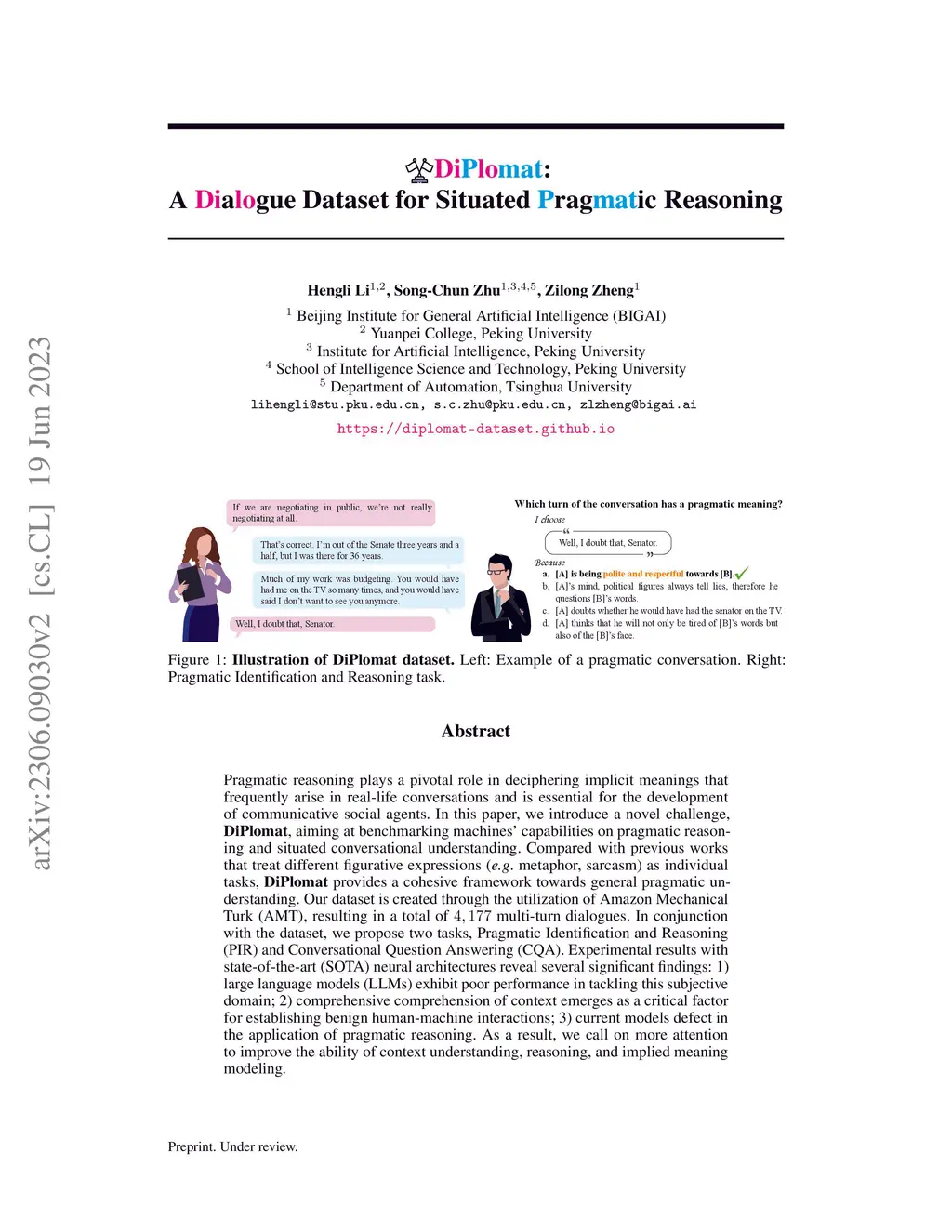 Pragmatic reasoning plays a pivotal role in deciphering implicit meanings that frequently arise in real-life conversations and is essential for the development of communicative social agents. In this paper, we introduce a novel challenge, DiPlomat, aiming at benchmarking machines' capabilities on pragmatic reasoning and situated conversational understanding. Compared with previous works that treat different figurative expressions (e.g. metaphor, sarcasm) as individual tasks, DiPlomat provides a cohesive framework towards general pragmatic understanding. Our dataset is created through the utilization of Amazon Mechanical Turk ( AMT ), resulting in a total of 4, 177 multi-turn dialogues. In conjunction with the dataset, we propose two tasks, Pragmatic Identification and Reasoning (PIR) and Conversational Question Answering (CQA). Experimental results with state-of-the-art (SOTA) neural architectures reveal several significant findings: 1) large language models ( LLMs) exhibit poor performance in tackling this subjective domain; 2) comprehensive comprehension of context emerges as a critical factor for establishing benign human-machine interactions; 3) current models defect in the application of pragmatic reasoning. As a result, we call on more attention to improve the ability of context understanding, reasoning, and implied meaning modeling.