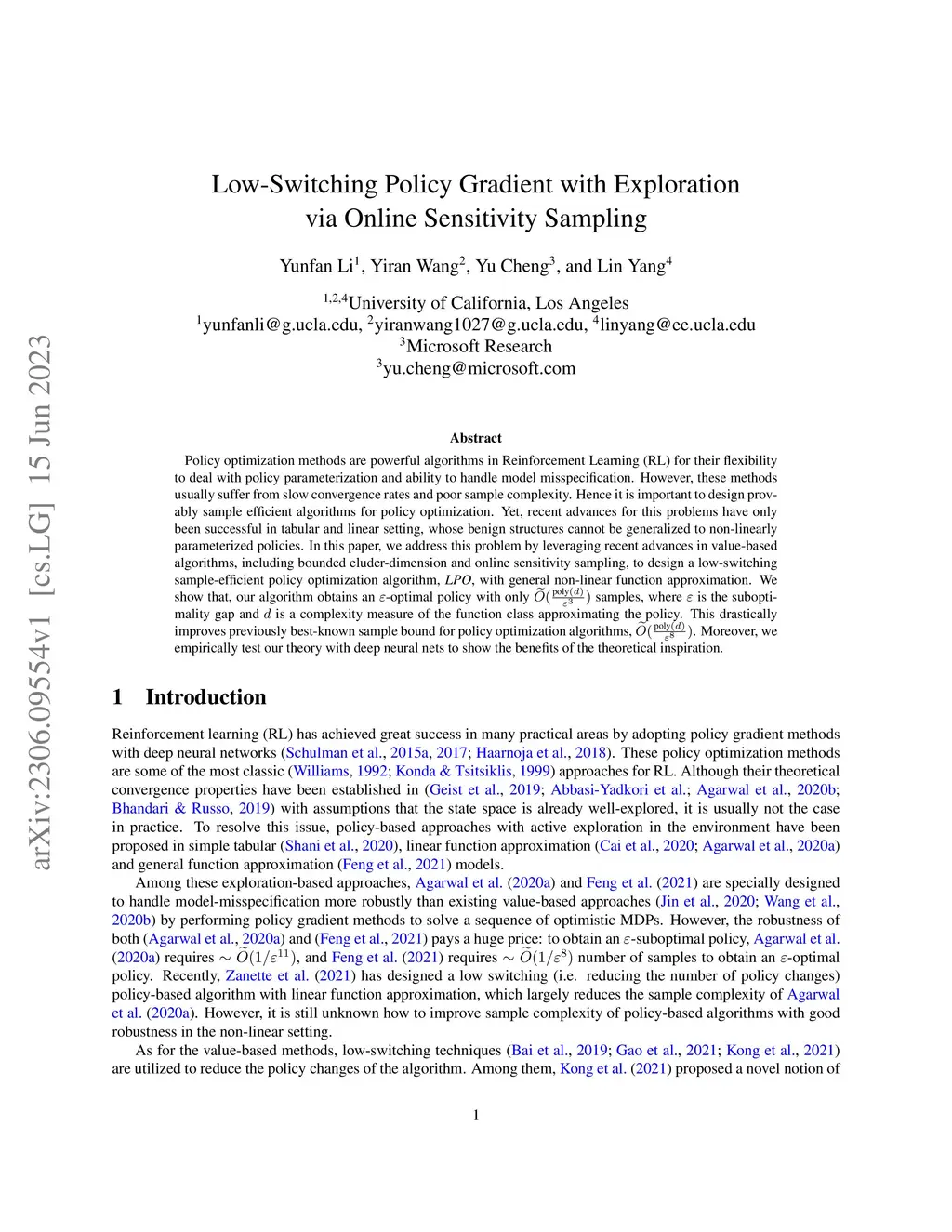 Policy optimization methods are powerful algorithms in Reinforcement Learning (RL) for their flexibility to deal with policy parameterization and ability to handle model misspecification. However, these methods usually suffer from slow convergence rates and poor sample complexity. Hence it is important to design provably sample efficient algorithms for policy optimization. Yet, recent advances for this problems have only been successful in tabular and linear setting, whose benign structures cannot be generalized to non-linearly parameterized policies. In this paper, we address this problem by leveraging recent advances in value-based algorithms, including bounded eluder-dimension and online sensitivity sampling, to design a low-switching sample-efficient policy optimization algorithm, LPO, with general non-linear function approximation. We show that, our algorithm obtains an -optimal policy with only samples, where is the suboptimality gap and is a complexity measure of the function class approximating the policy. This drastically improves previously best-known sample bound for policy optimization algorithms, . Moreover, we empirically test our theory with deep neural nets to show the benefits of the theoretical inspiration.