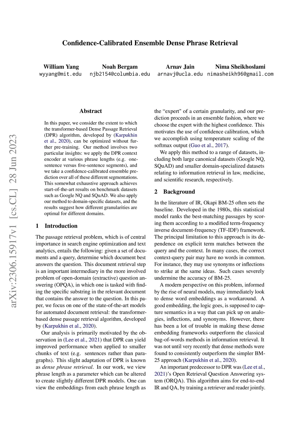In this paper, we consider the extent to which the transformer-based Dense Passage Retrieval (DPR) algorithm, developed by (Karpukhin et. al. 2020), can be optimized without further pre-training. Our method involves two particular insights: we apply the DPR context encoder at various phrase lengths (e.g. one-sentence versus five-sentence segments), and we take a confidence-calibrated ensemble prediction over all of these different segmentations. This somewhat exhaustive approach achieves start-of-the-art results on benchmark datasets such as Google NQ and SQuAD. We also apply our method to domain-specific datasets, and the results suggest how different granularities are optimal for different domains