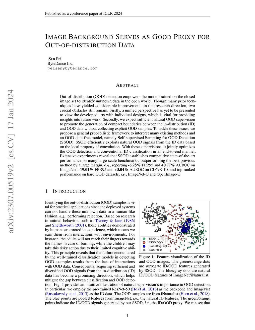 Out-of-distribution (OOD) detection empowers the model trained on the closed image set to identify unknown data in the open world. Though many prior techniques have yielded considerable improvements in this research direction, two crucial obstacles still remain. Firstly, a unified perspective has yet to be presented to view the developed arts with individual designs, which is vital for providing insights into future work. Secondly, we expect sufficient natural OOD supervision to promote the generation of compact boundaries between the in-distribution (ID) and OOD data without collecting explicit OOD samples. To tackle these issues, we propose a general probabilistic framework to interpret many existing methods and an OOD-data-free model, namely \textbf{S}elf-supervised \textbf{S}ampling for \textbf{O}OD \textbf{D}etection (SSOD). SSOD efficiently exploits natural OOD signals from the ID data based on the local property of convolution. With these supervisions, it jointly optimizes the OOD detection and conventional ID classification in an end-to-end manner. Extensive experiments reveal that SSOD establishes competitive state-of-the-art performance on many large-scale benchmarks, outperforming the best previous method by a large margin, \eg, reporting \textbf{-6.28\%} FPR95 and \textbf{+0.77\%} AUROC on ImageNet, \textbf{-19.01\%} FPR95 and \textbf{+3.04\%} AUROC on CIFAR-10, and top-ranked performance on hard OOD datasets, \ie, ImageNet-O and OpenImage-O.