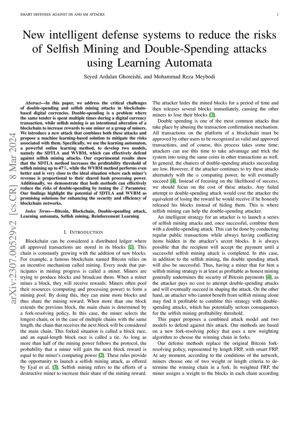 In this paper, we address the critical challenges of double-spending and selfish mining attacks in blockchain-based digital currencies. Double-spending is a problem where the same tender is spent multiple times during a digital currency transaction, while selfish mining is an intentional alteration of a blockchain to increase rewards to one miner or a group of miners. We introduce a new attack that combines both these attacks and propose a machine learning-based solution to mitigate the risks associated with them. Specifically, we use the learning automaton, a powerful online learning method, to develop two models, namely the SDTLA and WVBM, which can effectively defend against selfish mining attacks. Our experimental results show that the SDTLA method increases the profitability threshold of selfish mining up to 47, while the WVBM method performs even better and is very close to the ideal situation where each miner's revenue is proportional to their shared hash processing power. Additionally, we demonstrate that both methods can effectively reduce the risks of double-spending by tuning the Parameter. Our findings highlight the potential of SDTLA and WVBM as promising solutions for enhancing the security and efficiency of blockchain networks.