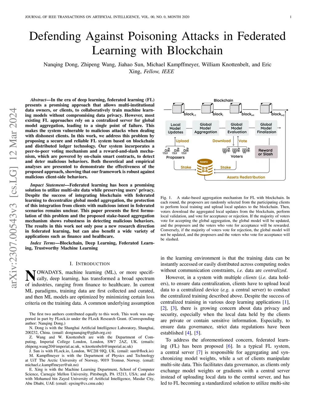 In the era of deep learning, federated learning (FL) presents a promising approach that allows multi-institutional data owners, or clients, to collaboratively train machine learning models without compromising data privacy. However, most existing FL approaches rely on a centralized server for global model aggregation, leading to a single point of failure. This makes the system vulnerable to malicious attacks when dealing with dishonest clients. In this work, we address this problem by proposing a secure and reliable FL system based on blockchain and distributed ledger technology. Our system incorporates a peer-to-peer voting mechanism and a reward-and-slash mechanism, which are powered by on-chain smart contracts, to detect and deter malicious behaviors. Both theoretical and empirical analyses are presented to demonstrate the effectiveness of the proposed approach, showing that our framework is robust against malicious client-side behaviors.