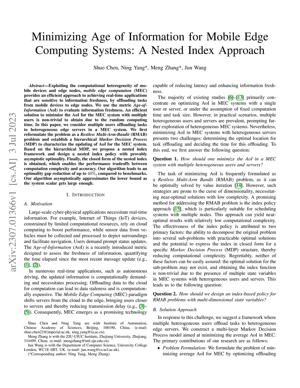 Exploiting the computational heterogeneity of mobile devices and edge nodes, mobile edge computation (MEC) provides an efficient approach to achieving real-time applications that are sensitive to information freshness, by offloading tasks from mobile devices to edge nodes. We use the metric Age-of-Information (AoI) to evaluate information freshness. An efficient solution to minimize the AoI for the MEC system with multiple users is non-trivial to obtain due to the random computing time. In this paper, we consider multiple users offloading tasks to heterogeneous edge servers in a MEC system. We first reformulate the problem as a Restless Multi-Arm-Bandit (RMAB) problem and establish a hierarchical Markov Decision Process (MDP) to characterize the updating of AoI for the MEC system. Based on the hierarchical MDP, we propose a nested index framework and design a nested index policy with provably asymptotic optimality. Finally, the closed form of the nested index is obtained, which enables the performance tradeoffs between computation complexity and accuracy. Our algorithm leads to an optimality gap reduction of up to 40%, compared to benchmarks. Our algorithm asymptotically approximates the lower bound as the system scalar gets large enough.