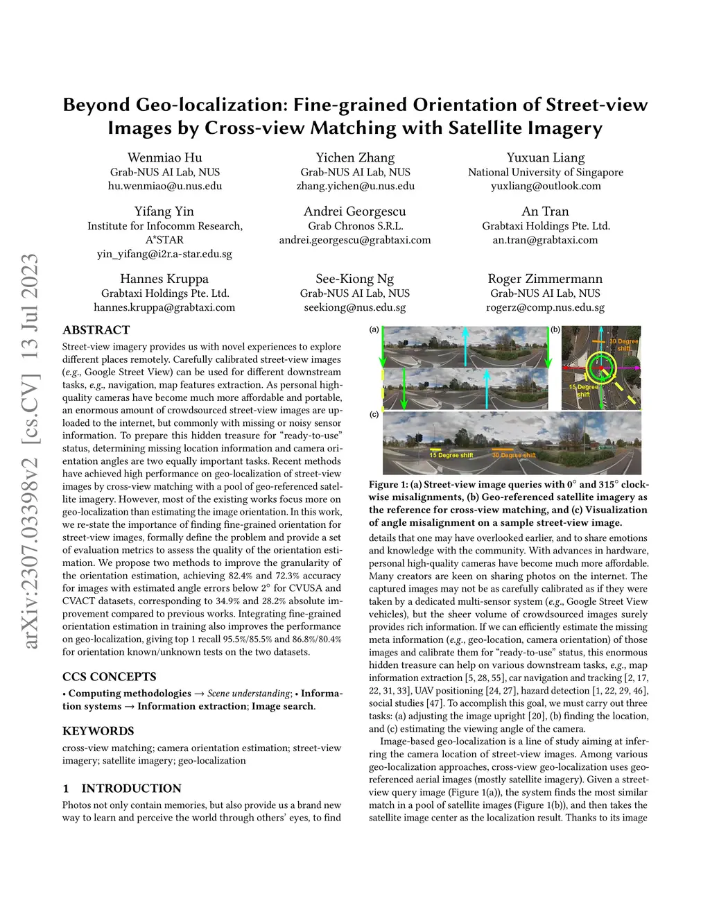 Street-view imagery provides us with novel experiences to explore different places remotely. Carefully calibrated street-view images (e.g. Google Street View) can be used for different downstream tasks, e.g. navigation, map features extraction. As personal high-quality cameras have become much more affordable and portable, an enormous amount of crowdsourced street-view images are uploaded to the internet, but commonly with missing or noisy sensor information. To prepare this hidden treasure for "ready-to-use" status, determining missing location information and camera orientation angles are two equally important tasks. Recent methods have achieved high performance on geo-localization of street-view images by cross-view matching with a pool of geo-referenced satellite imagery. However, most of the existing works focus more on geo-localization than estimating the image orientation. In this work, we re-state the importance of finding fine-grained orientation for street-view images, formally define the problem and provide a set of evaluation metrics to assess the quality of the orientation estimation. We propose two methods to improve the granularity of the orientation estimation, achieving 82.4% and 72.3% accuracy for images with estimated angle errors below 2 degrees for CVUSA and CVACT datasets, corresponding to 34.9% and 28.2% absolute improvement compared to previous works. Integrating fine-grained orientation estimation in training also improves the performance on geo-localization, giving top 1 recall 95.5%/85.5% and 86.8%/80.4% for orientation known/unknown tests on the two datasets.