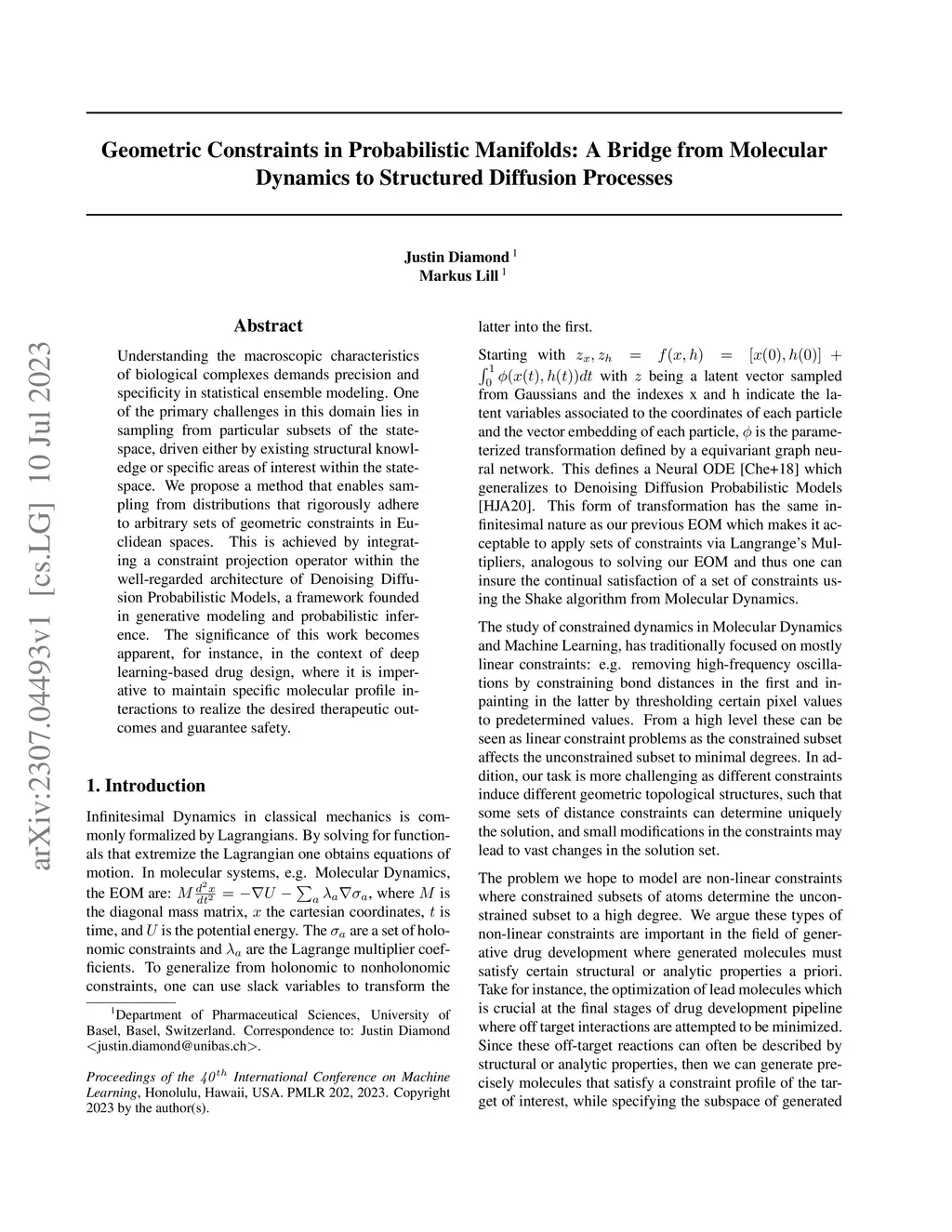Understanding the macroscopic characteristics of biological complexes demands precision and specificity in statistical ensemble modeling. One of the primary challenges in this domain lies in sampling from particular subsets of the state-space, driven either by existing structural knowledge or specific areas of interest within the state-space. We propose a method that enables sampling from distributions that rigorously adhere to arbitrary sets of geometric constraints in Euclidean spaces. This is achieved by integrating a constraint projection operator within the well-regarded architecture of Denoising Diffusion Probabilistic Models, a framework founded in generative modeling and probabilistic inference. The significance of this work becomes apparent, for instance, in the context of deep learning-based drug design, where it is imperative to maintain specific molecular profile interactions to realize the desired therapeutic outcomes and guarantee safety.