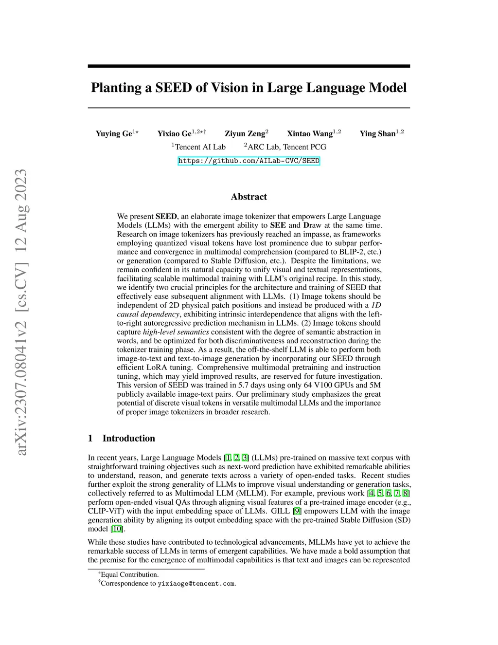 We present SEED, an elaborate image tokenizer that empowers Large Language Models (LLMs) with the emergent ability to SEE and Draw at the same time. Research on image tokenizers has previously reached an impasse, as frameworks employing quantized visual tokens have lost prominence due to subpar performance and convergence in multimodal comprehension (compared to BLIP-2, etc.) or generation (compared to Stable Diffusion, etc.). Despite the limitations, we remain confident in its natural capacity to unify visual and textual representations, facilitating scalable multimodal training with LLM's original recipe. In this study, we identify two crucial principles for the architecture and training of SEED that effectively ease subsequent alignment with LLMs. (1) Image tokens should be independent of 2D physical patch positions and instead be produced with a 1D causal dependency, exhibiting intrinsic interdependence that aligns with the left-to-right autoregressive prediction mechanism in LLMs. (2) Image tokens should capture high-level semantics consistent with the degree of semantic abstraction in words, and be optimized for both discriminativeness and reconstruction during the tokenizer training phase. As a result, the off-the-shelf LLM is able to perform both image-to-text and text-to-image generation by incorporating our SEED through efficient LoRA tuning. Comprehensive multimodal pretraining and instruction tuning, which may yield improved results, are reserved for future investigation. This version of SEED was trained in 5.7 days using only 64 V100 GPUs and 5M publicly available image-text pairs. Our preliminary study emphasizes the great potential of discrete visual tokens in versatile multimodal LLMs and the importance of proper image tokenizers in broader research.