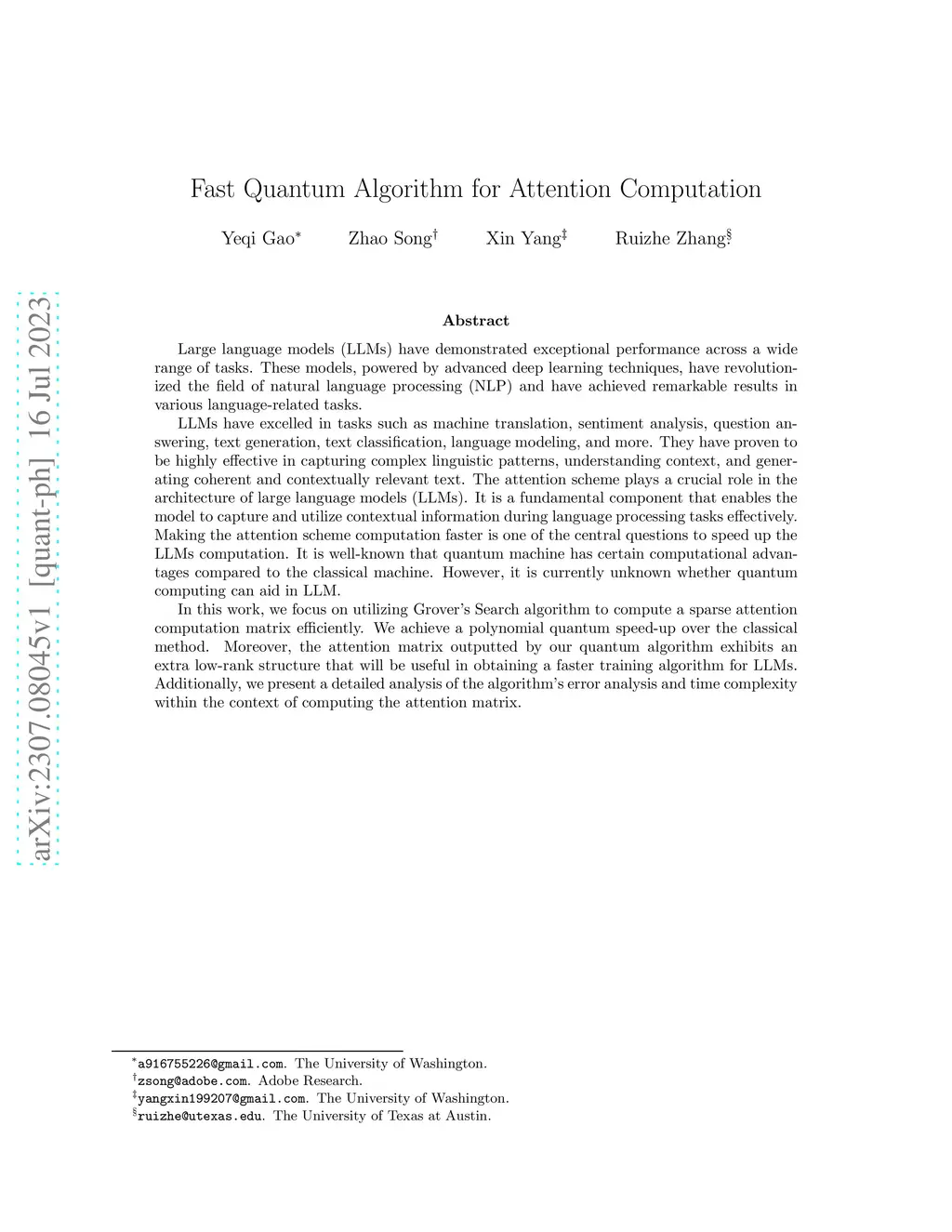As large language models (LLMs) demonstrate outstanding performance across various tasks, attention-driven models have profoundly transformed the field of machine learning. Since attention computations account for the primary computational overhead in both model inference and training, efficiently computing attention matrices has become one of the core challenges in accelerating large language models. It is well-known that quantum machines possess computational advantages over classical machines, and the role of quantum computing in LLMs remains largely unexplored. In this work, we focus on leveraging the Grover search algorithm to efficiently compute a sparse attention matrix. Through comparisons with classical algorithms, we demonstrate that our method achieves quantum acceleration in polynomial time. Additionally, we observe that the generated quantum attention matrices naturally exhibit low-rank structures, providing further theoretical support for efficient modeling. Moreover, within the specific context of attention matrix computation, we conduct a systematic and detailed analysis of the error and time complexity of the proposed algorithm.
