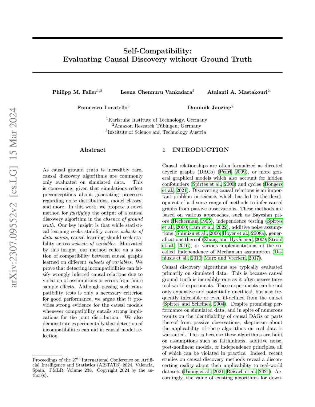 As causal ground truth is incredibly rare, causal discovery algorithms are commonly only evaluated on simulated data. This is concerning, given that simulations reflect preconceptions about generating processes regarding noise distributions, model classes, and more. In this work, we propose a novel method for falsifying the output of a causal discovery algorithm in the absence of ground truth. Our key insight is that while statistical learning seeks stability across subsets of data points, causal learning should seek stability across subsets of variables. Motivated by this insight, our method relies on a notion of compatibility between causal graphs learned on different subsets of variables. We prove that detecting incompatibilities can falsify wrongly inferred causal relations due to violation of assumptions or errors from finite sample effects. Although passing such compatibility tests is only a necessary criterion for good performance, we argue that it provides strong evidence for the causal models whenever compatibility entails strong implications for the joint distribution. We also demonstrate experimentally that detection of incompatibilities can aid in causal model selection.