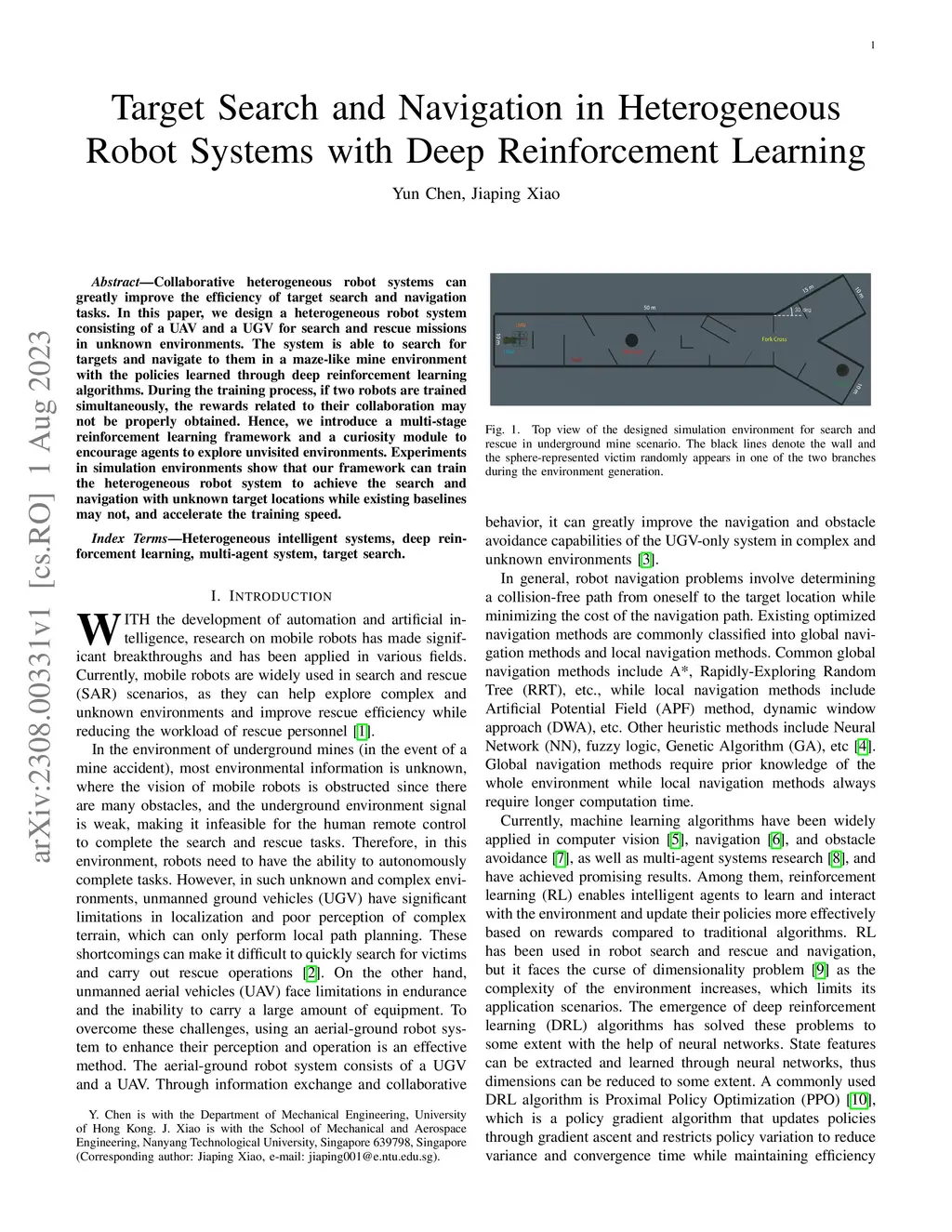 Collaborative heterogeneous robot systems can greatly improve the efficiency of target search and navigation tasks. In this paper, we design a heterogeneous robot system consisting of a UAV and a UGV for search and rescue missions in unknown environments. The system is able to search for targets and navigate to them in a maze-like mine environment with the policies learned through deep reinforcement learning algorithms. During the training process, if two robots are trained simultaneously, the rewards related to their collaboration may not be properly obtained. Hence, we introduce a multi-stage reinforcement learning framework and a curiosity module to encourage agents to explore unvisited environments. Experiments in simulation environments show that our framework can train the heterogeneous robot system to achieve the search and navigation with unknown target locations while existing baselines may not, and accelerate the training speed.