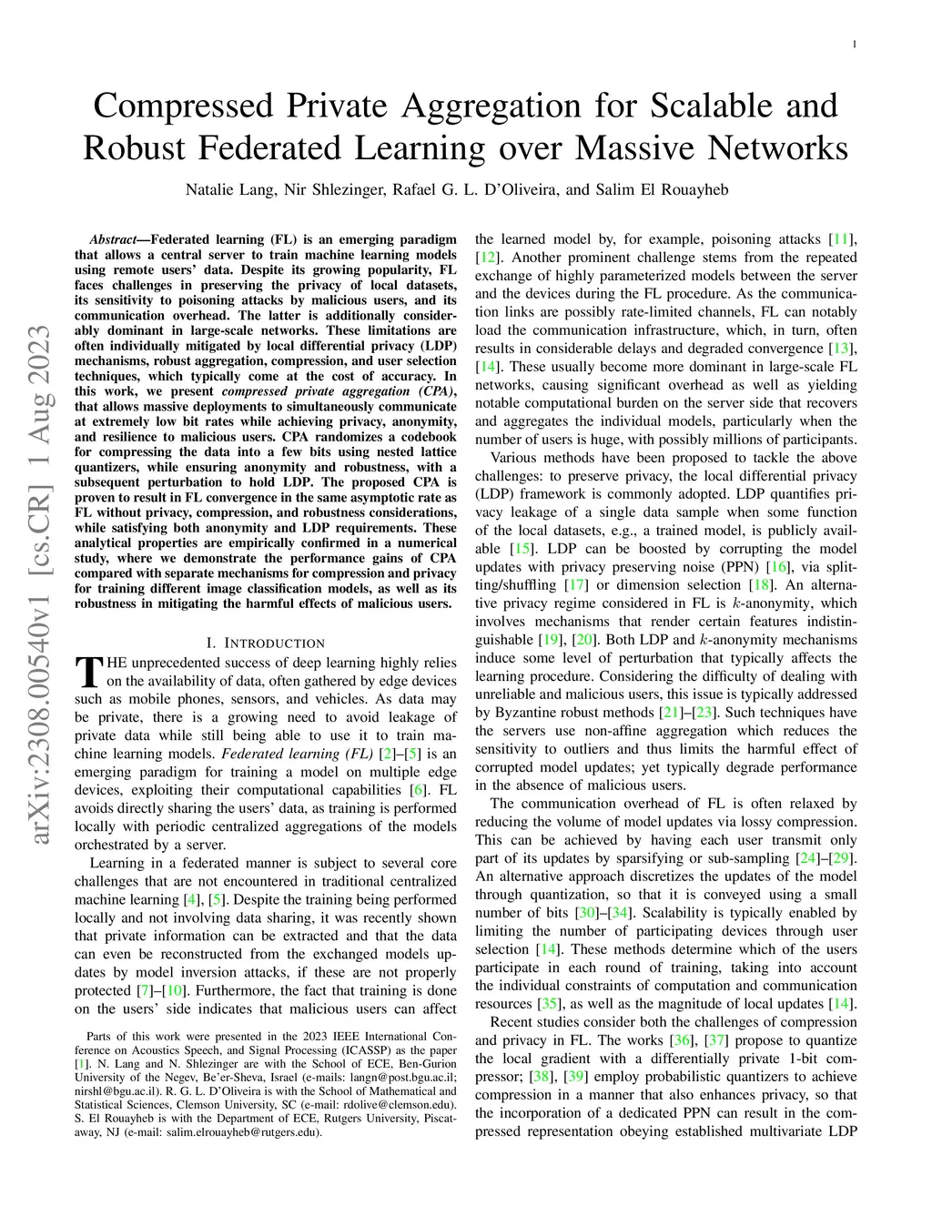 Federated learning (FL) is an emerging paradigm that allows a central server to train machine learning models using remote users' data. Despite its growing popularity, FL faces challenges in preserving the privacy of local datasets, its sensitivity to poisoning attacks by malicious users, and its communication overhead. The latter is additionally considerably dominant in large-scale networks. These limitations are often individually mitigated by local differential privacy (LDP) mechanisms, robust aggregation, compression, and user selection techniques, which typically come at the cost of accuracy. In this work, we present compressed private aggregation (CPA), that allows massive deployments to simultaneously communicate at extremely low bit rates while achieving privacy, anonymity, and resilience to malicious users. CPA randomizes a codebook for compressing the data into a few bits using nested lattice quantizers, while ensuring anonymity and robustness, with a subsequent perturbation to hold LDP. The proposed CPA is proven to result in FL convergence in the same asymptotic rate as FL without privacy, compression, and robustness considerations, while satisfying both anonymity and LDP requirements. These analytical properties are empirically confirmed in a numerical study, where we demonstrate the performance gains of CPA compared with separate mechanisms for compression and privacy for training different image classification models, as well as its robustness in mitigating the harmful effects of malicious users.