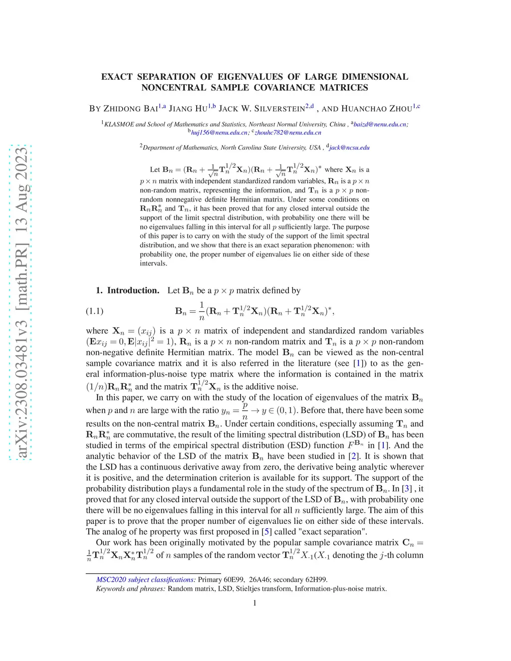 Let $ \bbB_n =\frac{1}{n}(\bbR_n + \bbT^{1/2}_n \bbX_n)(\bbR_n + \bbT^{1/2}_n \bbX_n)^* $ where $ \bbX_n $ is a $ p \times n $ matrix with independent standardized random variables, $ \bbR_n $ is a $ p \times n $ non-random matrix, representing the information, and $ \bbT_{n} $ is a $ p \times p $ non-random nonnegative definite Hermitian matrix. Under some conditions on $ \bbR_n \bbR_n^* $ and $ \bbT_n $, it has been proved that for any closed interval outside the support of the limit spectral distribution, with probability one there will be no eigenvalues falling in this interval for all $ p $ sufficiently large. The purpose of this paper is to carry on with the study of the support of the limit spectral distribution, and we show that there is an exact separation phenomenon: with probability one, the proper number of eigenvalues lie on either side of these intervals.