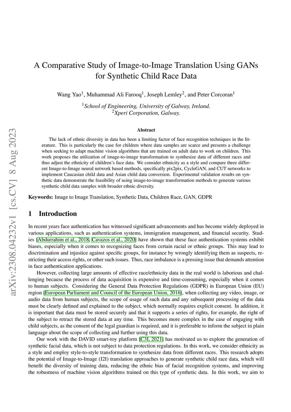 The lack of ethnic diversity in data has been a limiting factor of face recognition techniques in the literature. This is particularly the case for children where data samples are scarce and presents a challenge when seeking to adapt machine vision algorithms that are trained on adult data to work on children. This work proposes the utilization of image-to-image transformation to synthesize data of different races and thus adjust the ethnicity of children's face data. We consider ethnicity as a style and compare three different Image-to-Image neural network based methods, specifically pix2pix, CycleGAN, and CUT networks to implement Caucasian child data and Asian child data conversion. Experimental validation results on synthetic data demonstrate the feasibility of using image-to-image transformation methods to generate various synthetic child data samples with broader ethnic diversity.