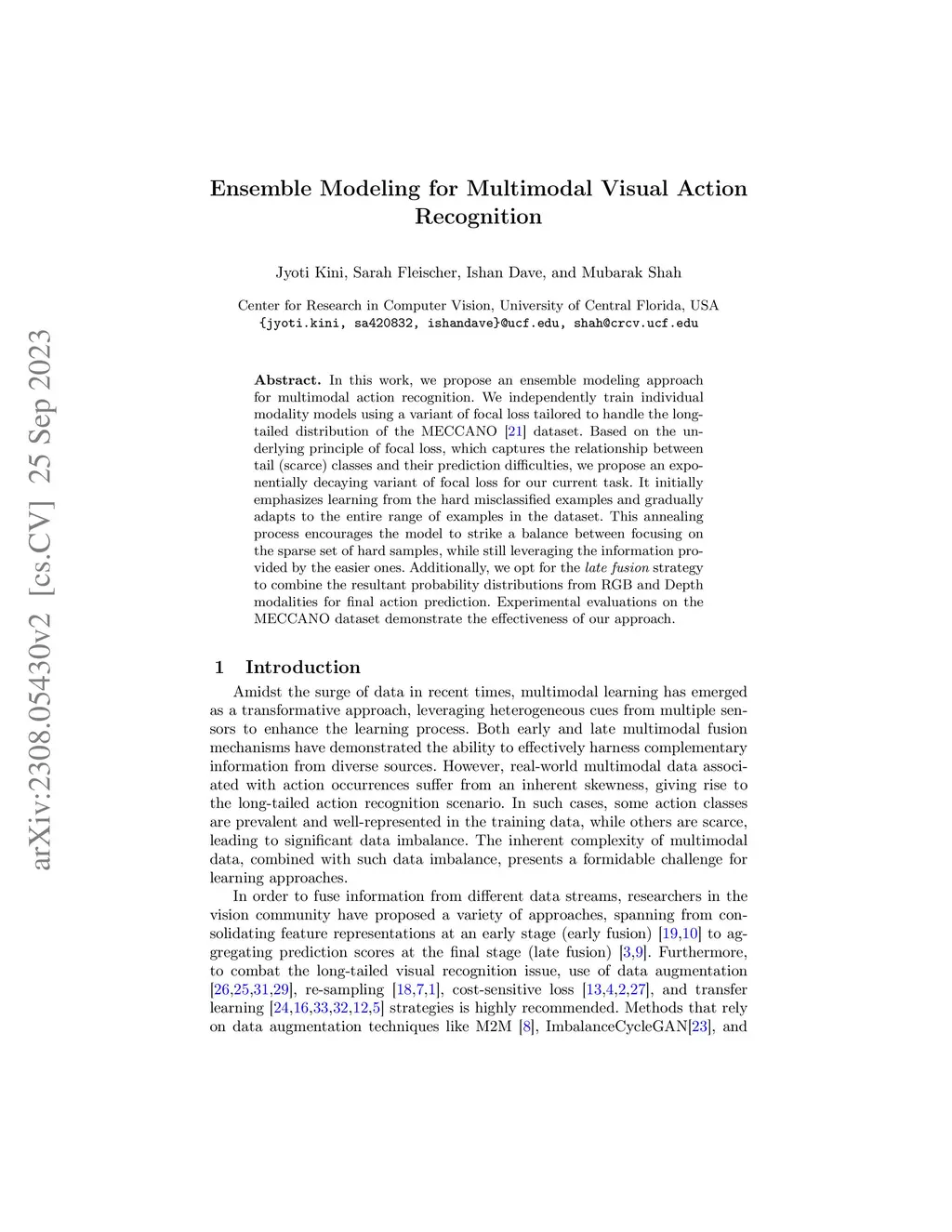 In this work, we propose an ensemble modeling approach for multimodal action recognition. We independently train individual modality models using a variant of focal loss tailored to handle the long-tailed distribution of the MECCANO [21] dataset. Based on the underlying principle of focal loss, which captures the relationship between tail (scarce) classes and their prediction difficulties, we propose an exponentially decaying variant of focal loss for our current task. It initially emphasizes learning from the hard misclassified examples and gradually adapts to the entire range of examples in the dataset. This annealing process encourages the model to strike a balance between focusing on the sparse set of hard samples, while still leveraging the information provided by the easier ones. Additionally, we opt for the late fusion strategy to combine the resultant probability distributions from RGB and Depth modalities for final action prediction. Experimental evaluations on the MECCANO dataset demonstrate the effectiveness of our approach.