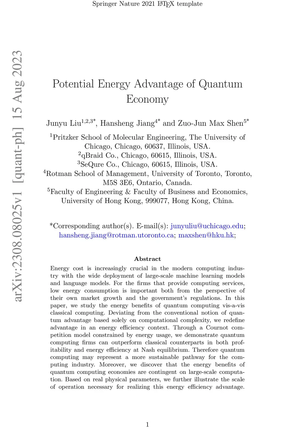 Energy cost is increasingly crucial in the modern computing industry with the wide deployment of large-scale machine learning models and language models. For the firms that provide computing services, low energy consumption is important both from the perspective of their own market growth and the government's regulations. In this paper, we study the energy benefits of quantum computing vis-a-vis classical computing. Deviating from the conventional notion of quantum advantage based solely on computational complexity, we redefine advantage in an energy efficiency context. Through a Cournot competition model constrained by energy usage, we demonstrate quantum computing firms can outperform classical counterparts in both profitability and energy efficiency at Nash equilibrium. Therefore quantum computing may represent a more sustainable pathway for the computing industry. Moreover, we discover that the energy benefits of quantum computing economies are contingent on large-scale computation. Based on real physical parameters, we further illustrate the scale of operation necessary for realizing this energy efficiency advantage.